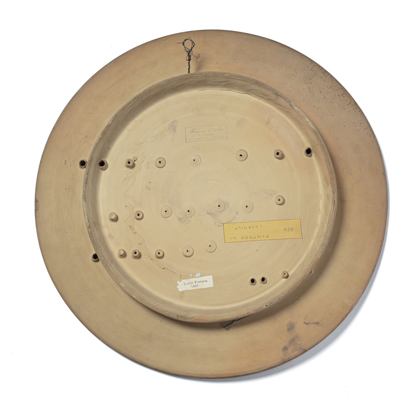 firma e datasul retro: timbro Galleria d'Arte il Prisma, MilanoL'opera è registrata presso la Fondazione Lucio Fontana con il n. 3319/1PROVENIENZACollezione privata, GallarateGalleria d'arte il Prisma, MilanoCollezione privata, MilanoESPOSIZIONIGalleria del Cavallino, Venezia 1957Galleria del Naviglio, Milano 1957BIBLIOGRAFIAL'Europeo, XVIII, n. 27, 8 luglio 1962. p. 33, Gottschaller, 2008, p. 39L'Europeo, XII, n. 7, luglio 2013, p. 59L. M. Barbero, Lucio Fontana. Catalogo ragionato delle sculture ceramiche, Milano 2022, vol. I, p. 106 e vol. II, p. 483, n. 57 SPC 55Dall'esplorazione tridimensionale delle sculture in ceramica fino ai suoi celebri tagli, Lucio Fontana indaga intellettualmente il continuo alternarsi tra pieno e vuoto, finito e infinito, luce e oscurità, materia e spazio.Il ciclo dei buchi, che si inaugura nel 1949 come naturale evoluzione della ricerca proposta due anni prima con il Primo Manifesto dello Spazialismo, diviene massima espressione del barocchismo di Fontana proprio nell'incontro con le potenzialità espressive della terracotta, mezzo duttile e malleabile, sensibile al gesto per sua natura.I 'concetti spaziali' su terracotta colorata graffita con buchi rappresentano il punto d'incontro con lo studio plastico degli anni Trenta, sintetizzando l'intera ricerca artistica di Fontana che insiste sui concetti di antimateria, gestualità e unità delle arti per il superamento di forme già conosciute.'Io buco, passa l’infinito di lì, passa la luce, non c’è bisogno di dipingere. Tutti han creduto che io volessi distruggere: ma non è vero, io ho costruito, non distrutto, è lì la cosa. Che, dopo, io gli dia una strutturazione estetica [...] è una ragione di gusto estetico'(Lucio Fontana)