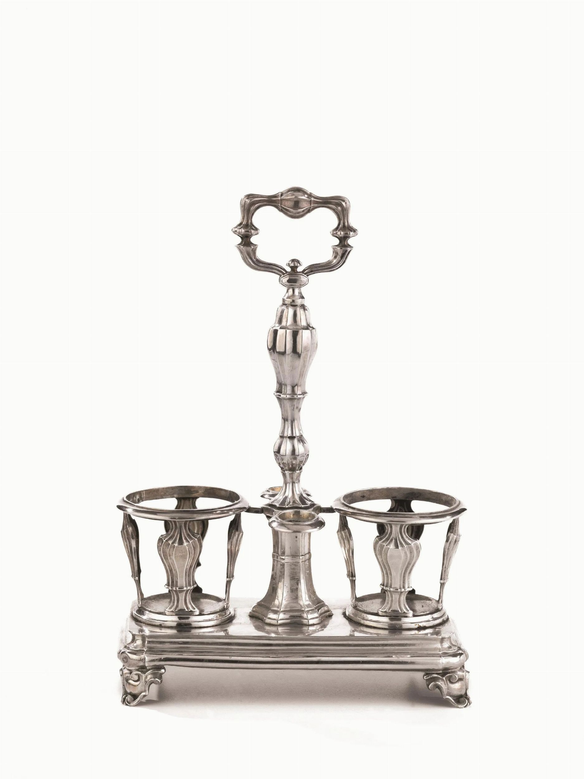 base rettangolare poggiante su quattro piedini a volute, fusto scanalato a balaustro, presa di forma rettangolare sagomata, priva di ampolle, alt. cm 32, g 525