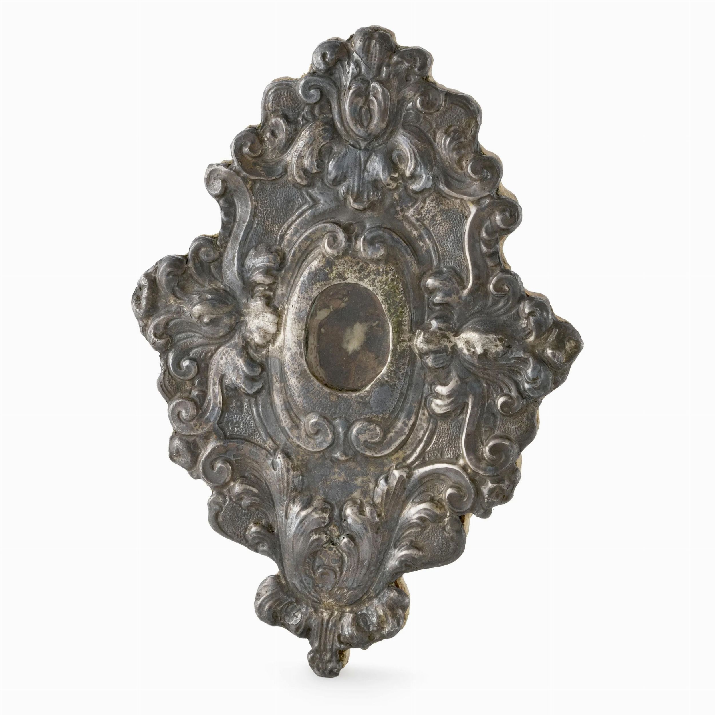 in lamina d'argento sbalzata a volute e applicata su legno, al centro teca in vetro, sul retro due sigilli in ceralacca, cm 16x11