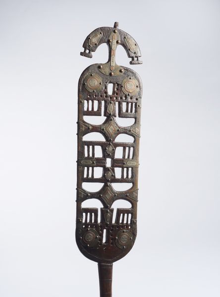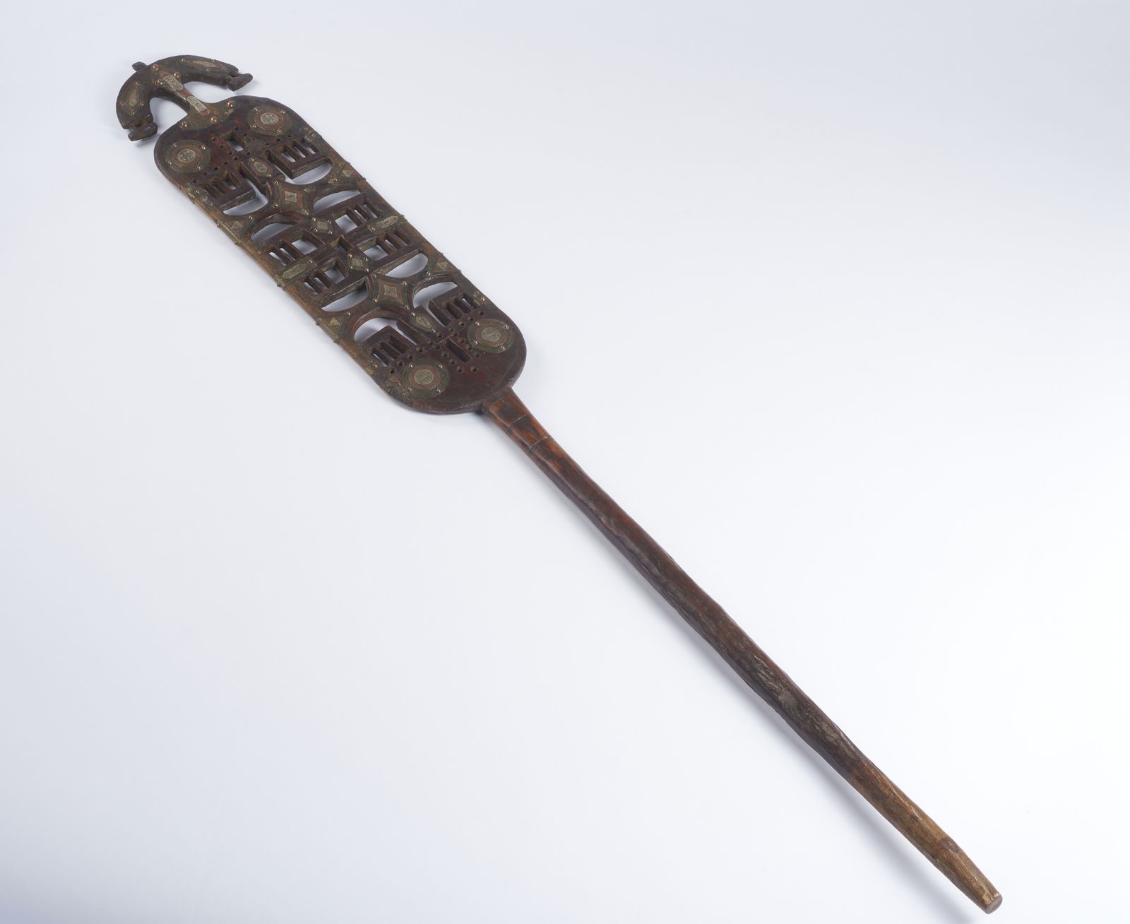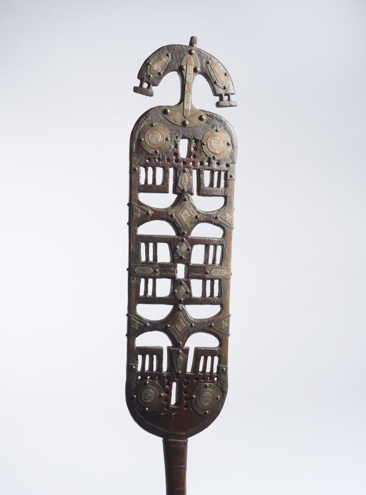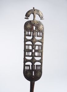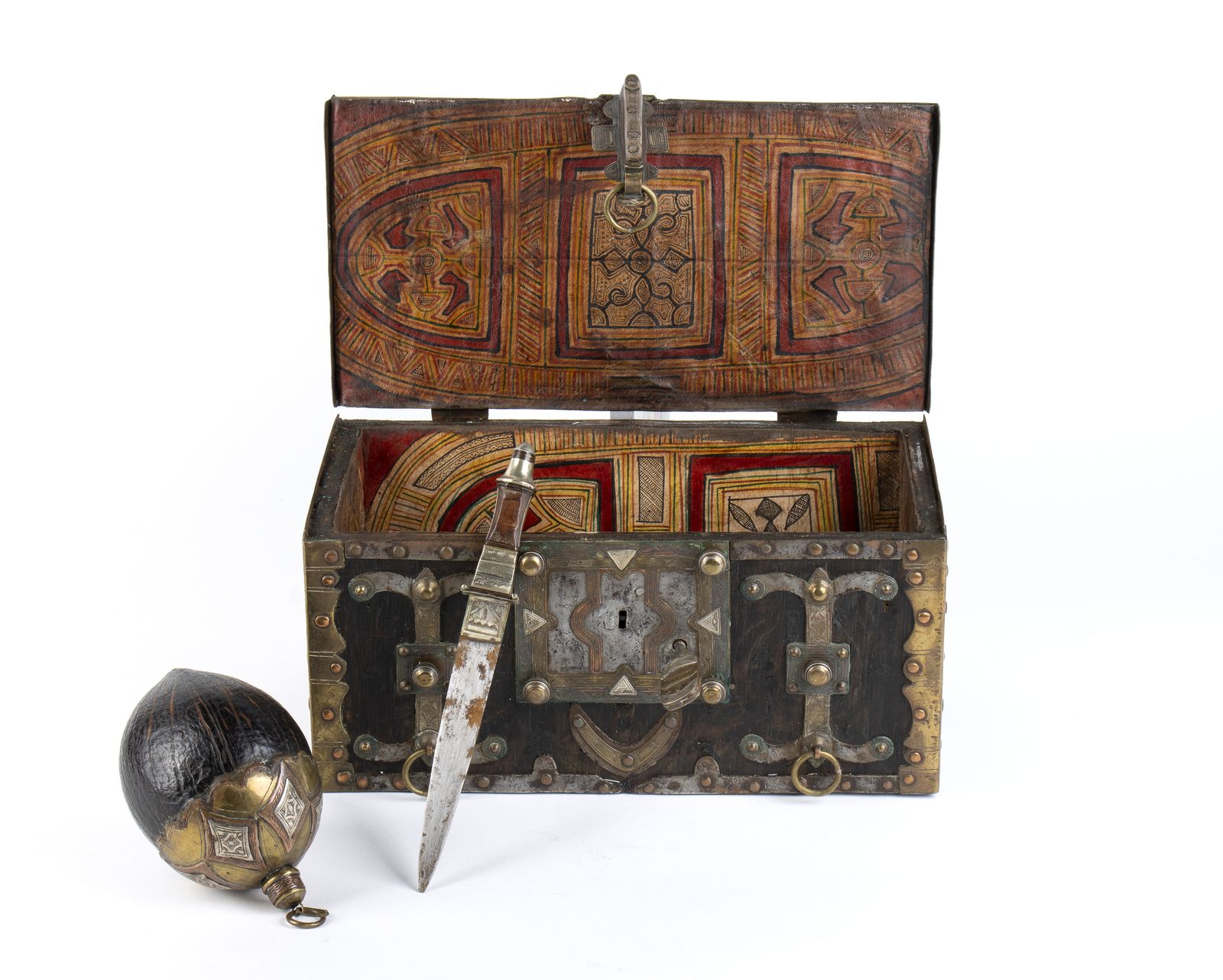 Lotto composto da scatola con corredo Tuareg e scettro Ehel. Popolazioni Tuareg di lingua Amazigh. Africa Occidentale, Regione di Sahel, Mauritania, fine XIX secolo – Inizio XX secolo.Ehel, Insegna Cerimoniale Matrimoniale per Tenda.Legno intagliato, inserti in metallo (bronzo, rame, argento).Sebbene sia un oggetto funzionale, l’ehel qui offerto si differenzia dagli altri esemplari conservati presso collezioni museali internazionali per la squisita raffinatezza dell’intaglio, reso da una trama geometrica astratta dal ritmo modulare cadenzato. L’oggetto, di natura funzionale ma, a sua volta, anche demarcatore di status, è composto da due parti: l’asta, la quale veniva inserita nella sabbia per sostenere e delimitare lo spazio della camera matrimoniale, e la parte superiore riccamente decorata, che fungeva da sostegno per raffinati pannelli di cuoio e/o stuoie decorative donate agli sposi, o per sorreggere le sacche da viaggio della coppia. Il reticolo geometrico è stato impreziosito dall’applicazione di sottili lamelle decorative in argento, rame e ottone, fissate con borchie, a loro volta incise con motivi geometrici di retaggio berbero, riscontrabili anche nei monili utilizzati dalle donne. La presenza di materiale prezioso è indice della doppia funzionalità dell’oggetto: quando la tenda veniva smontata durante gli spostamenti, il capo Tuareg del gruppo si contraddistingueva tramite l’utilizzo dell’ehel il quale, da oggetto cerimoniale acquisiva il ruolo di insegna di potere, raddoppiando così il suo significato. Inoltre, la patina scura osservabile sulla superficie dell’oggetto suggerisce un uso prolungato nel tempo, collocandolo probabilmente tra la fine del XIX secolo e gli inizi del XX secolo.Cofanetto portagioie. Legno intagliato, inserti in metallo (bronzo, rame, argento, ottone), pigmenti.Splendido cofanetto rettangolare porta gioielli realizzato in ebano impreziosito esternamente con delicate lastre metalliche in ottone bianco e argento, rame rosso e rame giallo, due di queste fungono anche da cerniere atte all’apertura dell’oggetto. Mentre il perimetro esterno del cofanetto presenta una decorazione in metallo semplice scandita da piccole sfere che prosegue sui lati corti e sul retro, la parte frontale e superiore è riempita da combinazioni di motivi geometrici intricati i quali presentano raffinate incisioni. L’estetica Tuareg predilige prettamente una figurazione a triangoli, rettangoli e quadrati, in quanto pregni di simbologia. Le forme triangolari, ad esempio, vengono utilizzate ed indossate come protezione contro gli spiriti maligni. Inoltre, l’argento è anche considerato avere un valore benefico, in grado di attirare al bakara, ovvero benedizioni, felicità e buona fortuna.Il cofanetto, realizzato interamente a mano da uno o più artisti Tuareg, è stato utilizzato da una neo sposa per conservare al suo interno la dote, composta da preziosi monili e talismani ereditati dalla madre e regalati dal marito dopo le nozze. In genere, la quantità e la tipologia di gioielli utilizzati demarca lo status sociale della donna, segnalando se fosse nubile, sposata o vedova.La rarità dell’oggetto si riscontra all’interno, in quanto il legno si presenta foderato di cuoio e riccamente dipinto con pigmenti naturali ricreanti simboli protettivi e beneauguranti per la sposa. Tra i talismani riscontrabili si può notare una mano di Fatima, simbolo di protezione, fortuna e gioia.Il cofanetto presenta lucchetto con chiave originale perfettamente funzionante decorata in metallo finemente lavorato.Telek, pugnale da polso. Legno, inserti in metallo, pelle, pigmenti.In occasione di feste locali e di matrimoni in cui vengono organizzate competizioni in sella ai cammelli, gli uomini Tuareg usano adornare le loro vesti con un telek, pugnale da polso a lama corta, e una spada (takoba).Il raffinato telek in oggetto, completo di custodia originale realizzata in legno, metallo e pelle tinta di colore verde, presenta lama a punta forgiata in ferro, ed elsa in legno e metallo lavorato con delicate incisioni geometriche richiamanti la ricca simbologia Tuareg. Il telek veniva inserito nella parte interna dell’avambraccio ed agganciato alla veste tramite dei lacerti di pelle annodati ai due anelli applicati ai lati della custodia. In genere, l’elsa del telek viene posiziona verso il polso per facilitarne l’estrazione.Fiaschetta. Noce di cocco, sughero, corda, inserti in metallo (bronzo, rame, argento).Raro esemplare di noce di cocco essiccata e riutilizzata dagli uomini Tuareg come fiaschetta per trasportare liquidi, probabilmente acqua, acqua distillata o sostanze alcoliche. L’unicità dell’oggetto è data dalla copertura realizzata in metallo con inserti a losanghe in bronzo e argento, incisi con motivi geometrici prediletti dal gusto estetico degli artisti Tuareg. La fiaschetta è dotata di tappo in sughero estraibile, decorato in bronzo e rame. L’anello applicato sulla sommità del tappo presenta ancora la doppia cordicella con cui gli uomini Tuareg agganciavano la fiaschetta alla loro cinta.Provenienza: Collezione privata, Vicenza.Bibliografia:• Loughran, K. 2003. Jewelry, Fashion and Identity. The Tuareg Example. African Arts pp. 52-95.• Seligman, K. T. 2006. Art of Being Tuareg Sahara Nomads in a Modern World. African Arts 39(3): 56-79.• Hagan, E., Meters, L. 2006. Tuareg Jewelry: Traditional Patterns and Symbols. Xlibris.• Bickford Berzock, K. 2019. Caravans of Gold, Fragments in Time: Art, Culture, and Exchange across Medieval Saharan Africa. Princeton University of Press.Credits: Dott.ssa Deborah Dainese'.