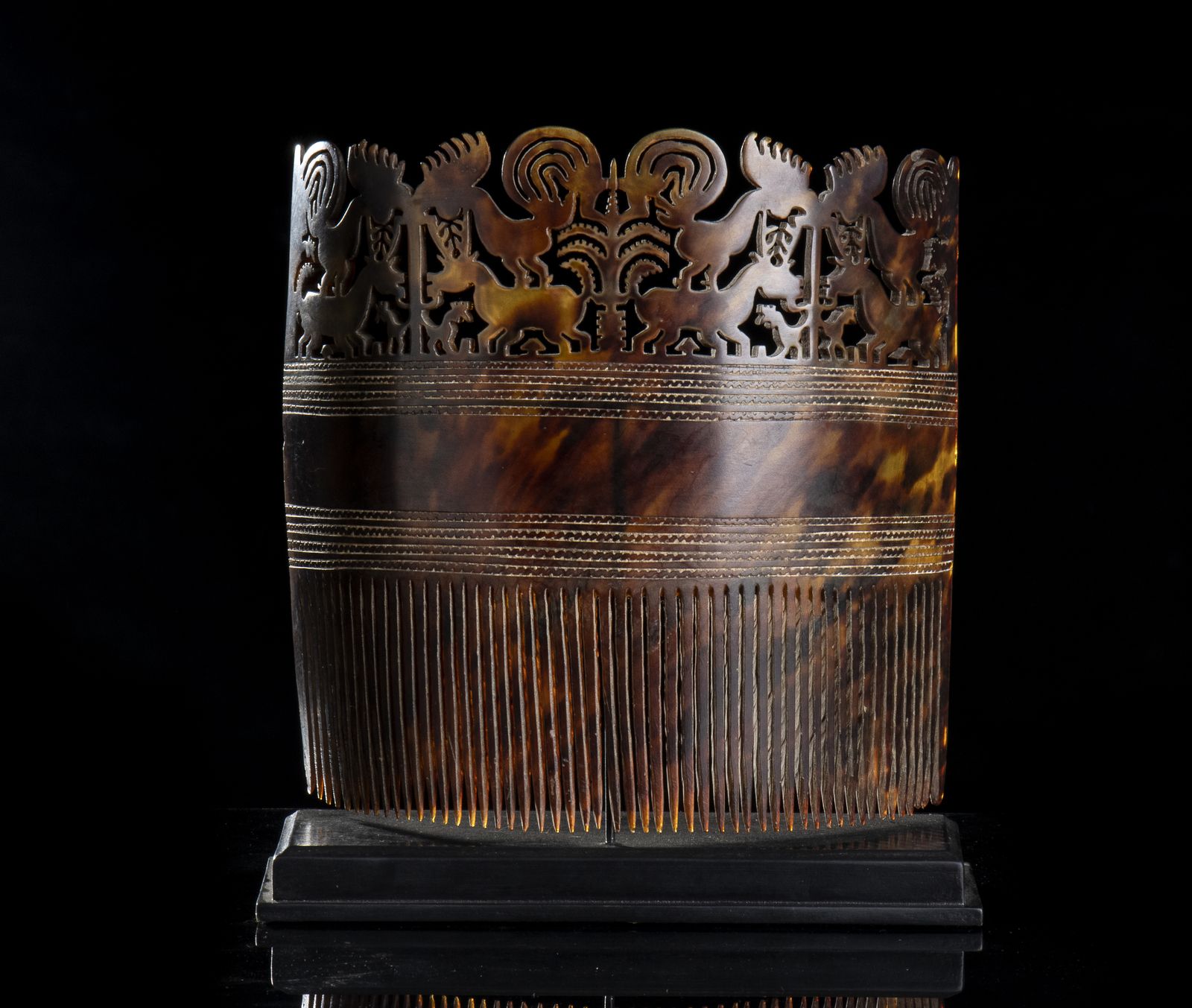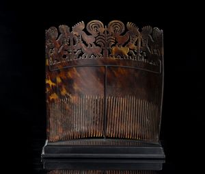 Pettine in tartaruga chiamato HAI KARA JANGGA, indossato dalle giovani in attesa di marito e dalle donne di rango elevato come simbolo di prestigio. La parte superiore presenta un decoro intagliato di animali con al centro l'albero rituale.Bibliografia: ''Power and Gold'', Barbier - Mueller Museum, Geneva. Numero oggetto 110, pag. 289 e 329, anno 1985.Accompagnato da perizia ai fini Cites, 4 ottobre 2023