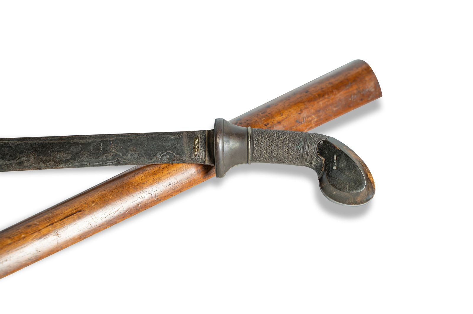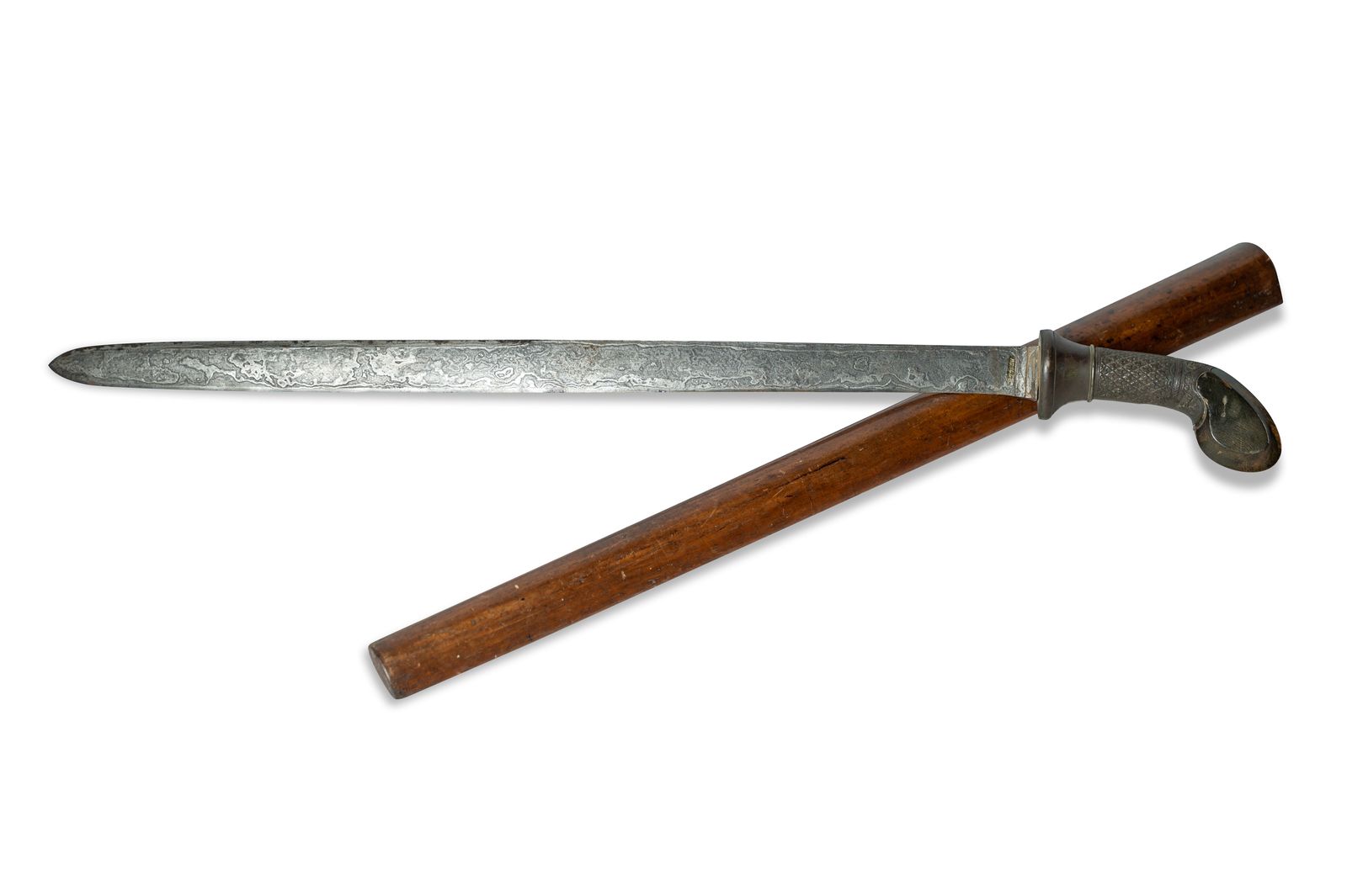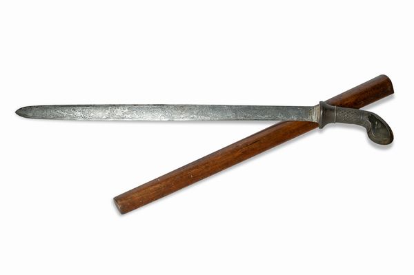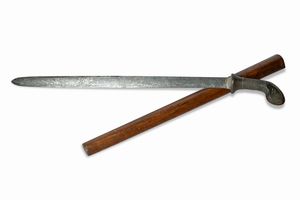 Spada rara completa di fodero con lama raffinata in acciaio Damasco. Vicino all'impugnatura si legge AG. 1440 che indica l'appartenenza dell'oggetto alla collezione di Roland Grunewald De Mortillet, direttore del Museo Trocadero nei i primi decenni del '900.