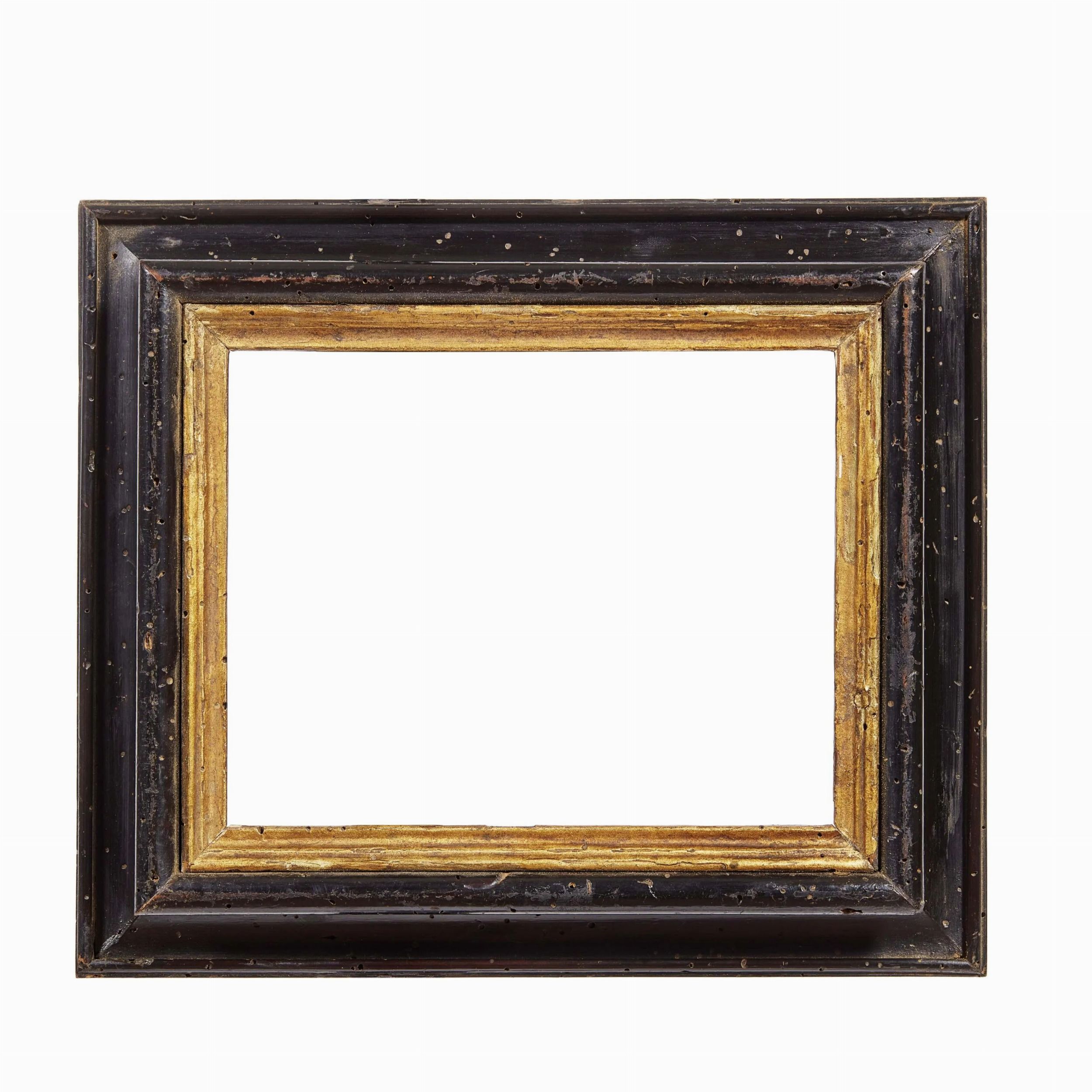 in legno ebanizzato e parzialmente dorato, battuta dorata sale su più fasce modanate e profilo bombato, si porta a muro tramite gola e profilo modanato, ingombro cm 33,4x28,7, luce cm 21,8x17,2