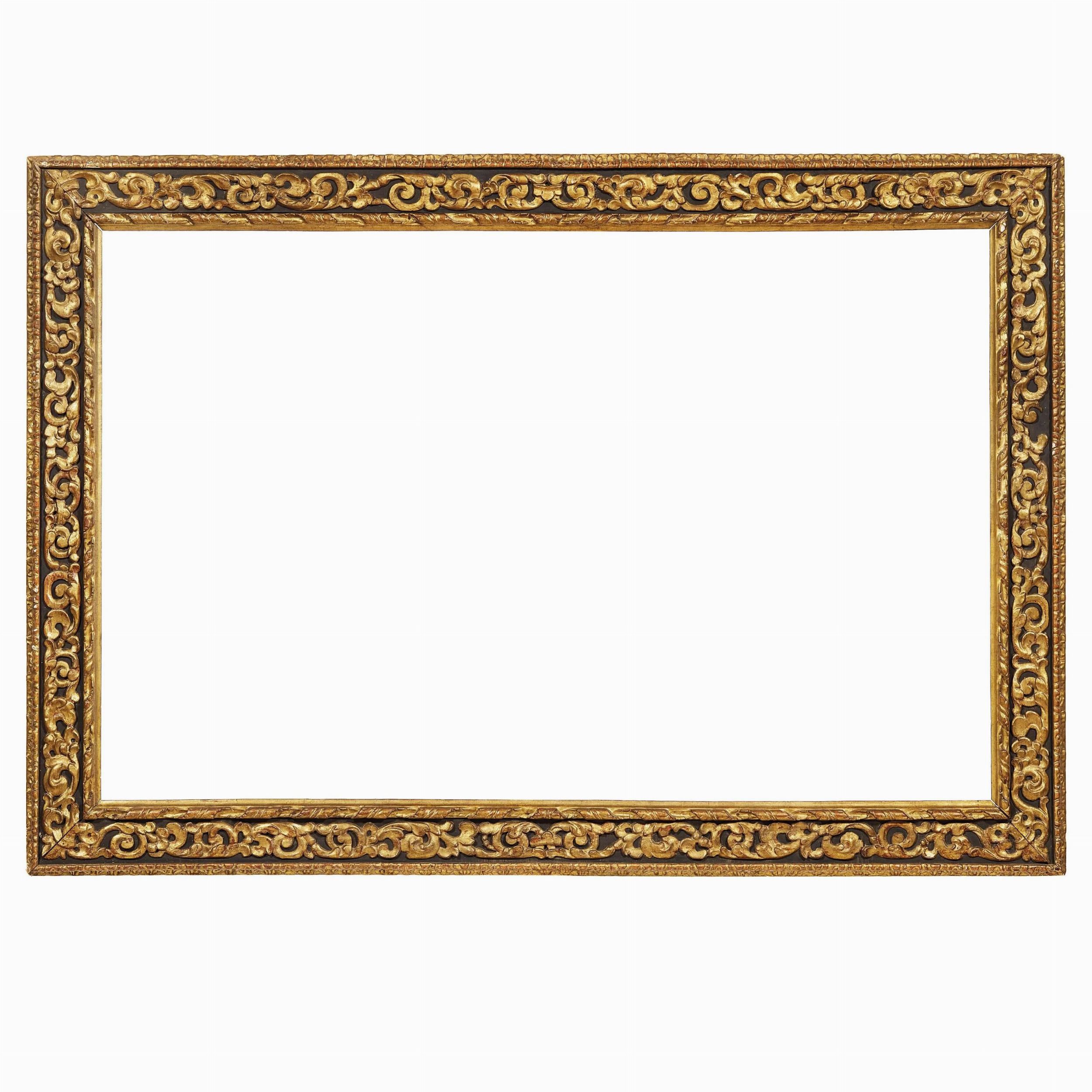CORNICE, EMILIA, SECOLO XVII in legno ebanizzato e dorato, sottile battuta dorata si apre su fascia a nastro di foglie, fascia centrale arricchita da intaglio a girali e volute fogliacee, si porta a muro tramite fascia a foglie di cavolo, ingombro cm 136x199, luce cm 107x170