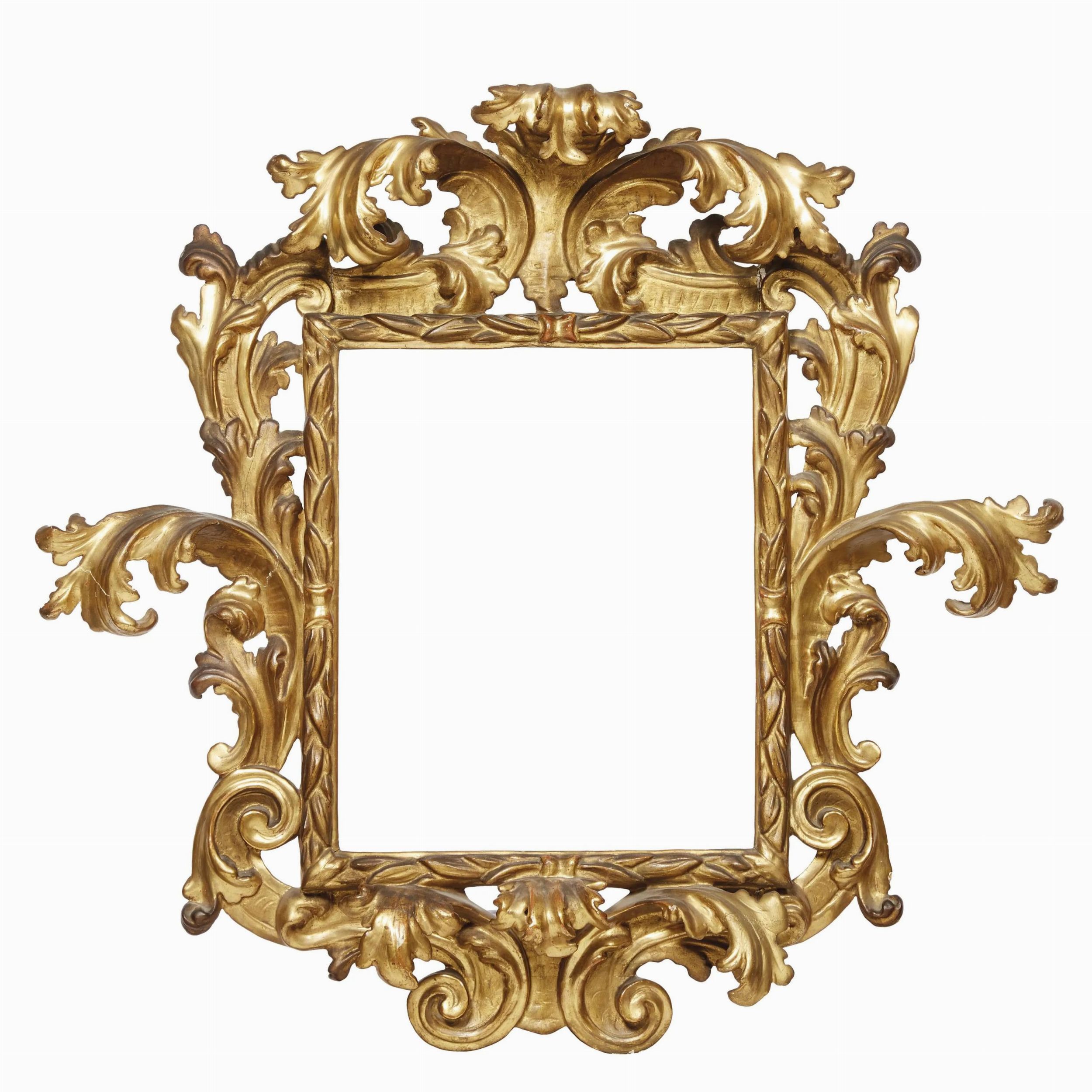 CORNICE, EMILIA, SECOLO XVII in legno intagliato e dorato, battuta si porta su grande fascia rilevata intagliata a foglie lanceolate che si dipartono da nastri posti ai centri, interamente contornato da ricco intaglio a giorno di grandi racemi fogliacei che dal centro inferiore si portano con esuberanti volute verso grande cimasa dalla quale ricadono verso il basso; ingombro cm 91x96,5, luce cm 46,5x38,7