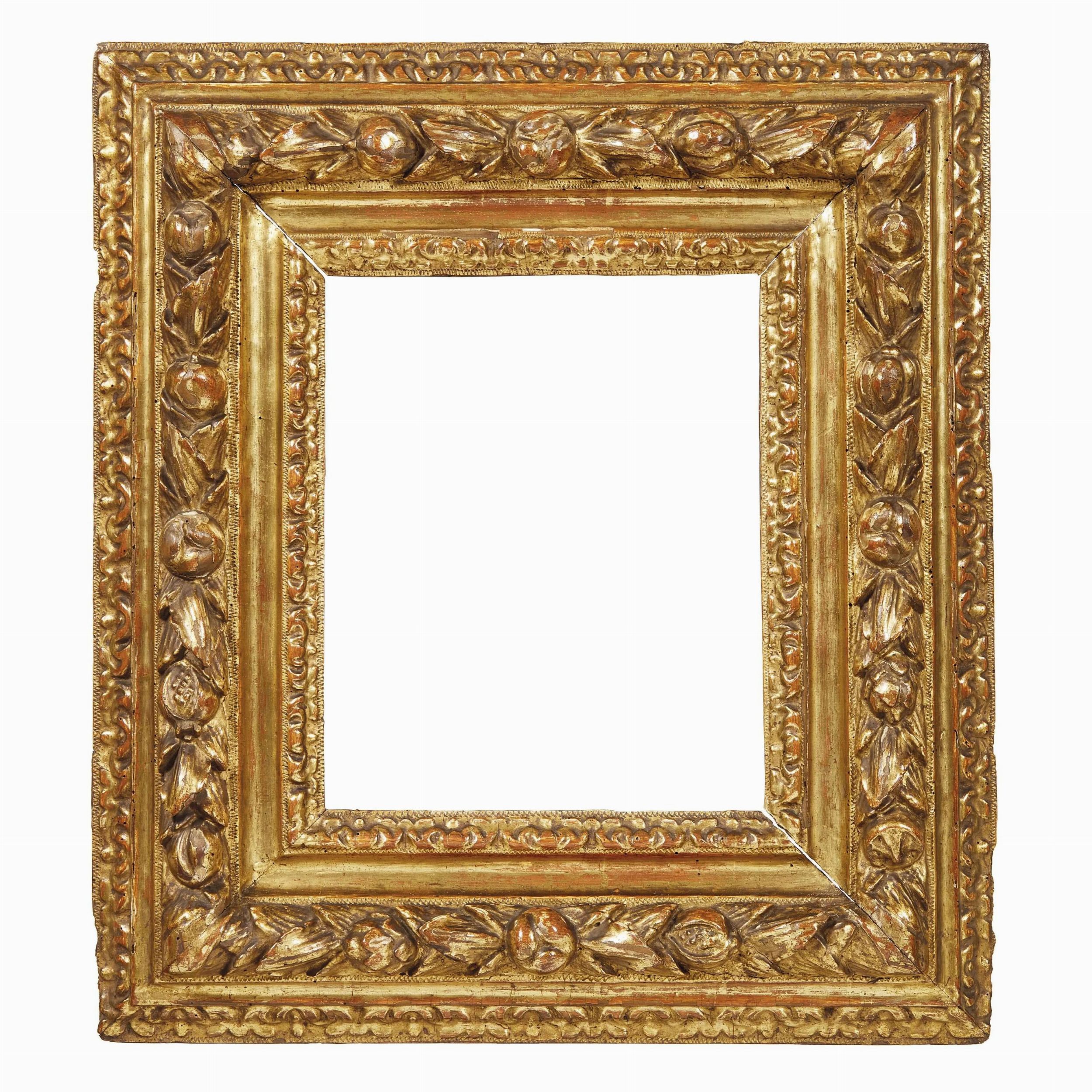 in legno intagliato e dorato, battuta intagliata a foglie di cavolo scende su gola liscia, fascia centrale riccamente intagliata con motivo a ghirlanda di fiori e frutti, si porta a muro tramite fascia a foglie di cavolo, ingombro cm 57,5x51, luce cm 30,3x24,9
