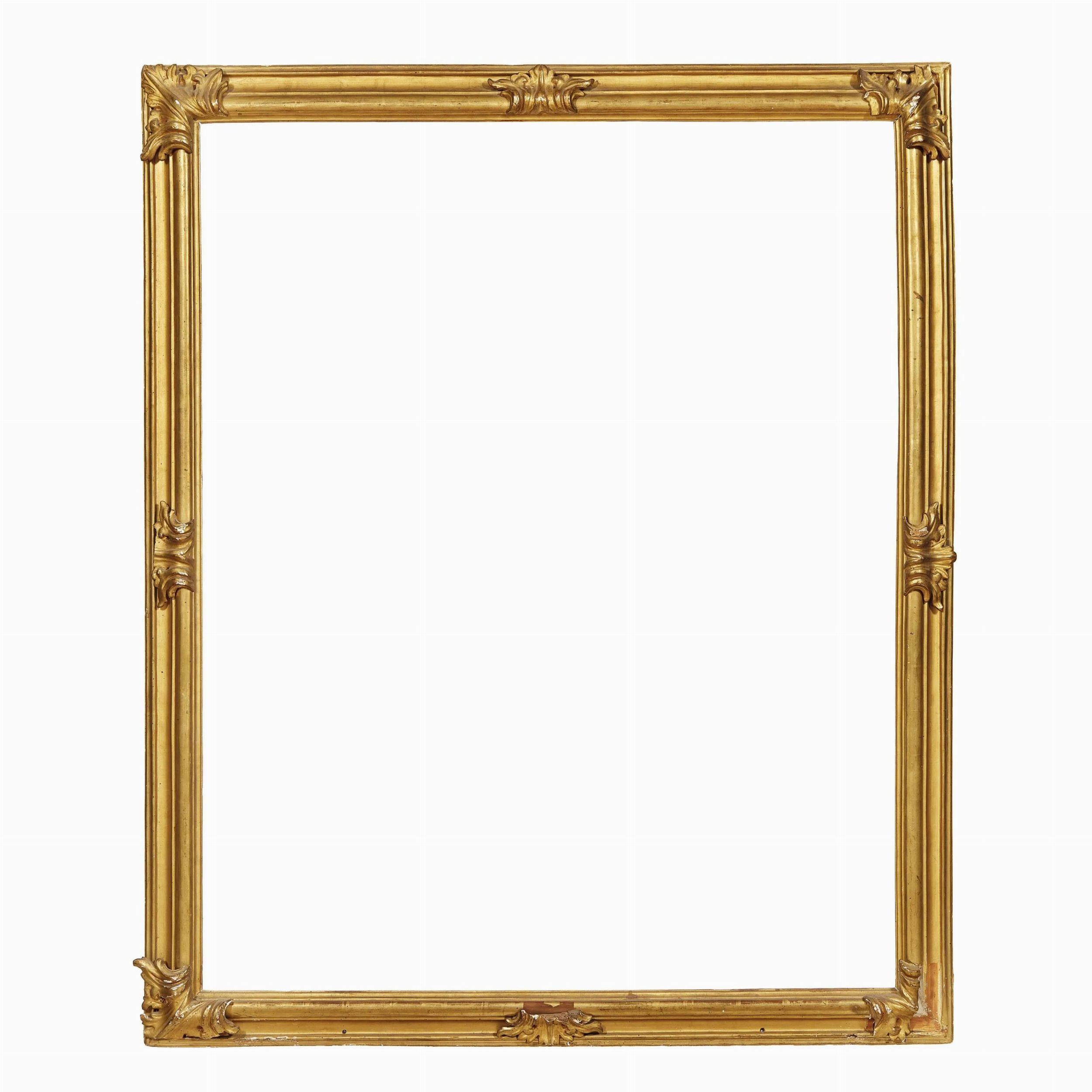 in legno intagliato e dorato, applicazioni di foglie d'acanto aperte agli angoli e ai centri, ingombro cm 145,5x120,5, luce cm 128x103