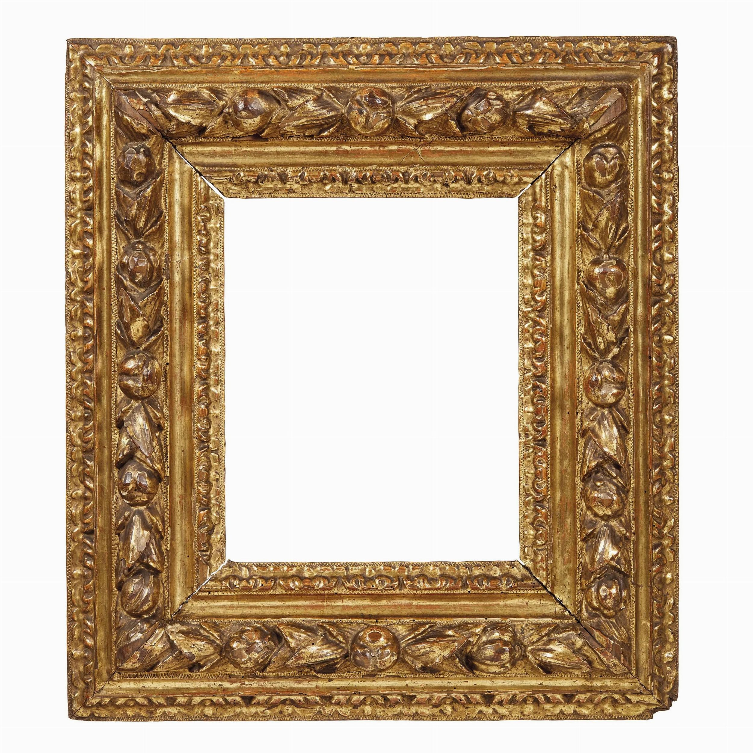 in legno intagliato e dorato, battuta intagliata a foglie di cavolo scende su gola liscia, fascia centrale riccamente intagliata con motivo a ghirlanda di fiori e frutti, si porta a muro tramite fascia a foglie di cavolo, ingombro cm 57,5x51, luce cm 30,3x24,6