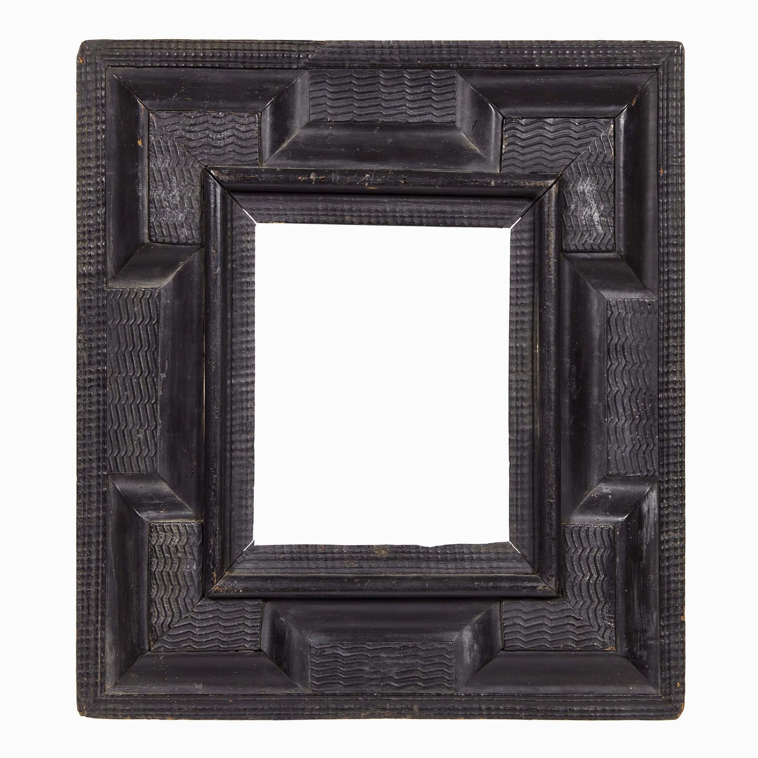 in legno ebanizzato e intagliato a guilloché , con ampiangoli rilevati di linea sagomata interessati da motivo ondulato, ingombro cm 49x44, luce cm 22,7x18