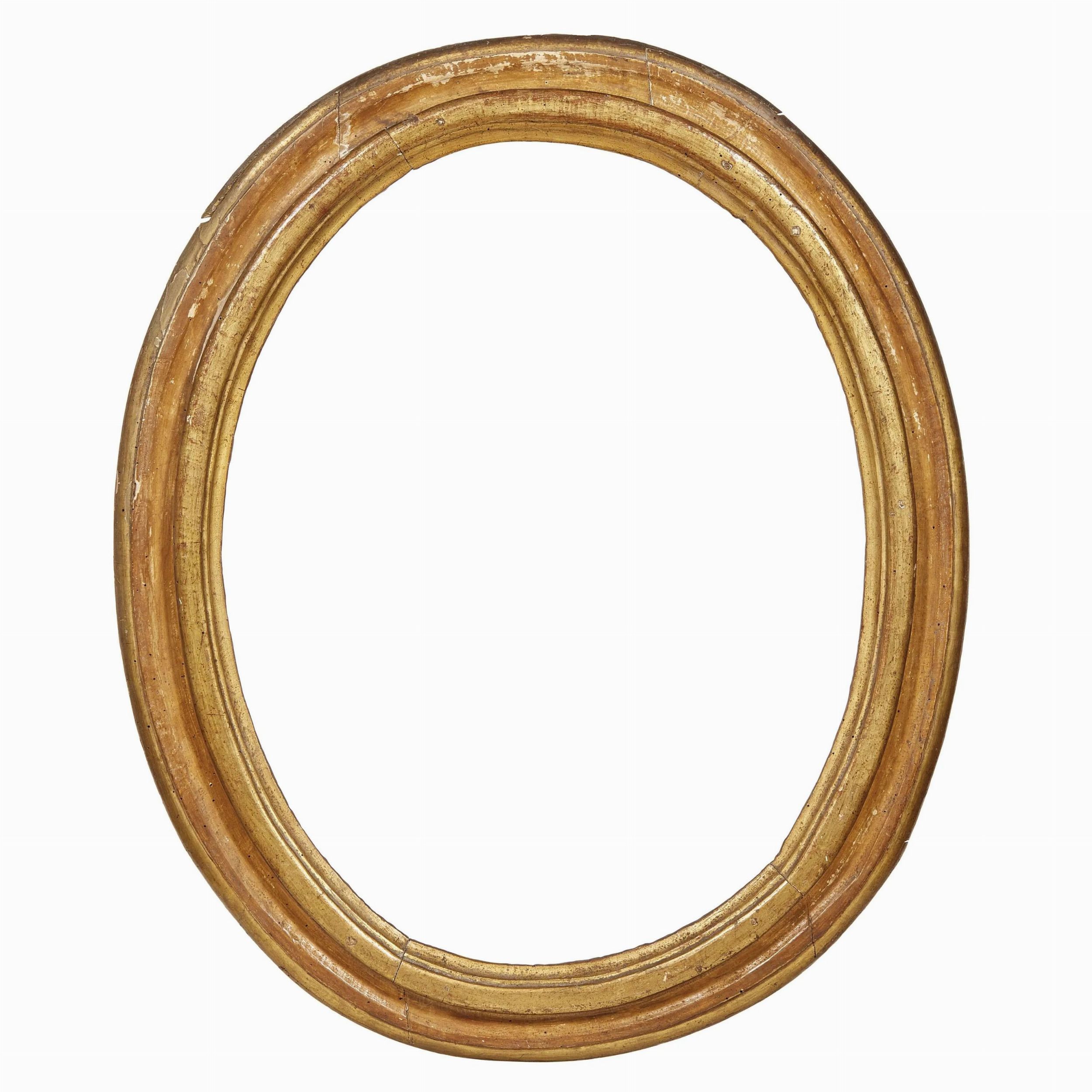 in legno intagliato e dorato di forma ovale, battuta si apre su più ordini di modanature, ingombro cm 91,5x76,3, luce cm 72,7x57