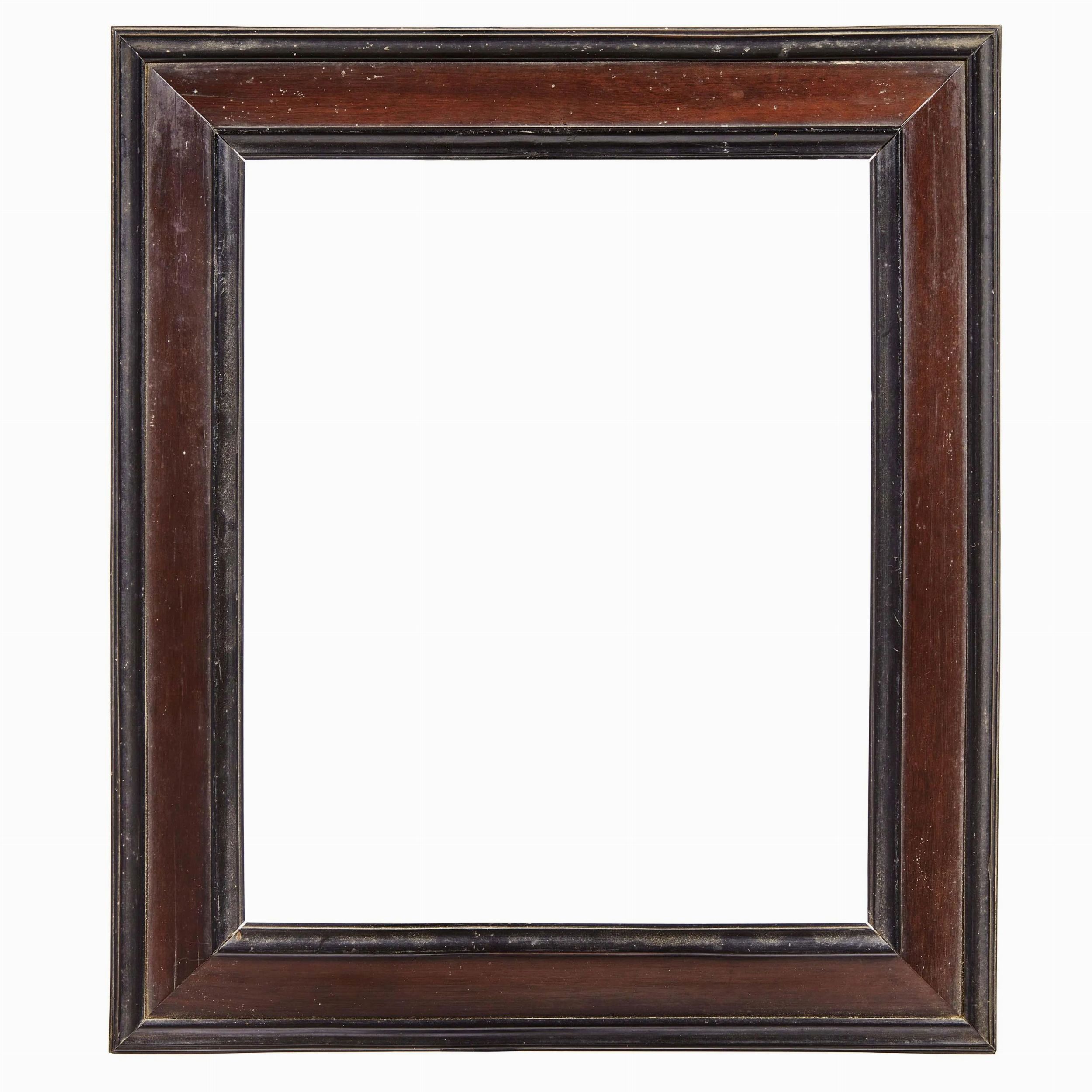 in legno intagliato ed ebanizzato, sagoma a cassetta liscia, battuta e profilatura esterna in legno più scuro, ingombro cm 44,7x38,8, luce cm 32,9x27