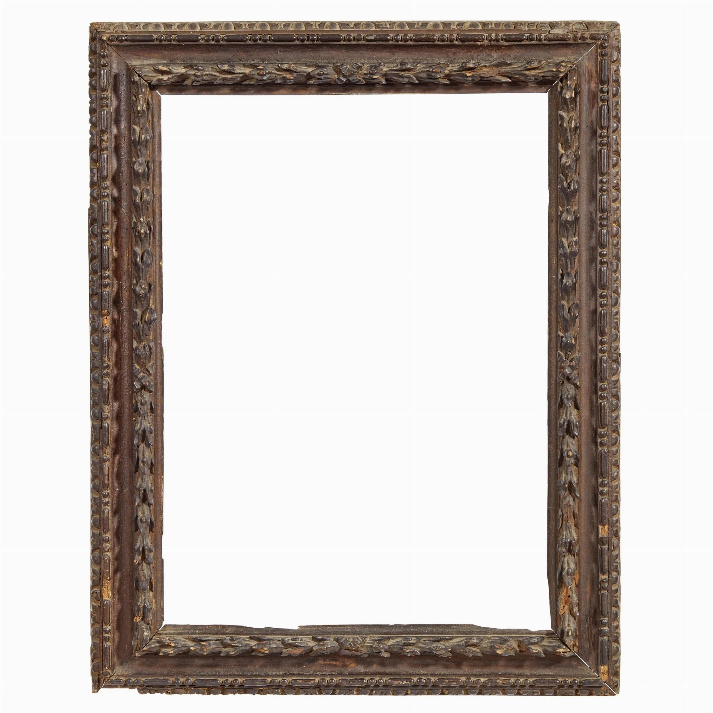 in legno intagliato, sottile battuta si apre su fascia a foglie lanceolate racchiuse da nastri ai centri su gola liscia per proseguire in profilo a perline e fusarole, si porta al mure tramite fascia bacellata, ingombro cm 94,2x74,1, luce cm 74x53,5