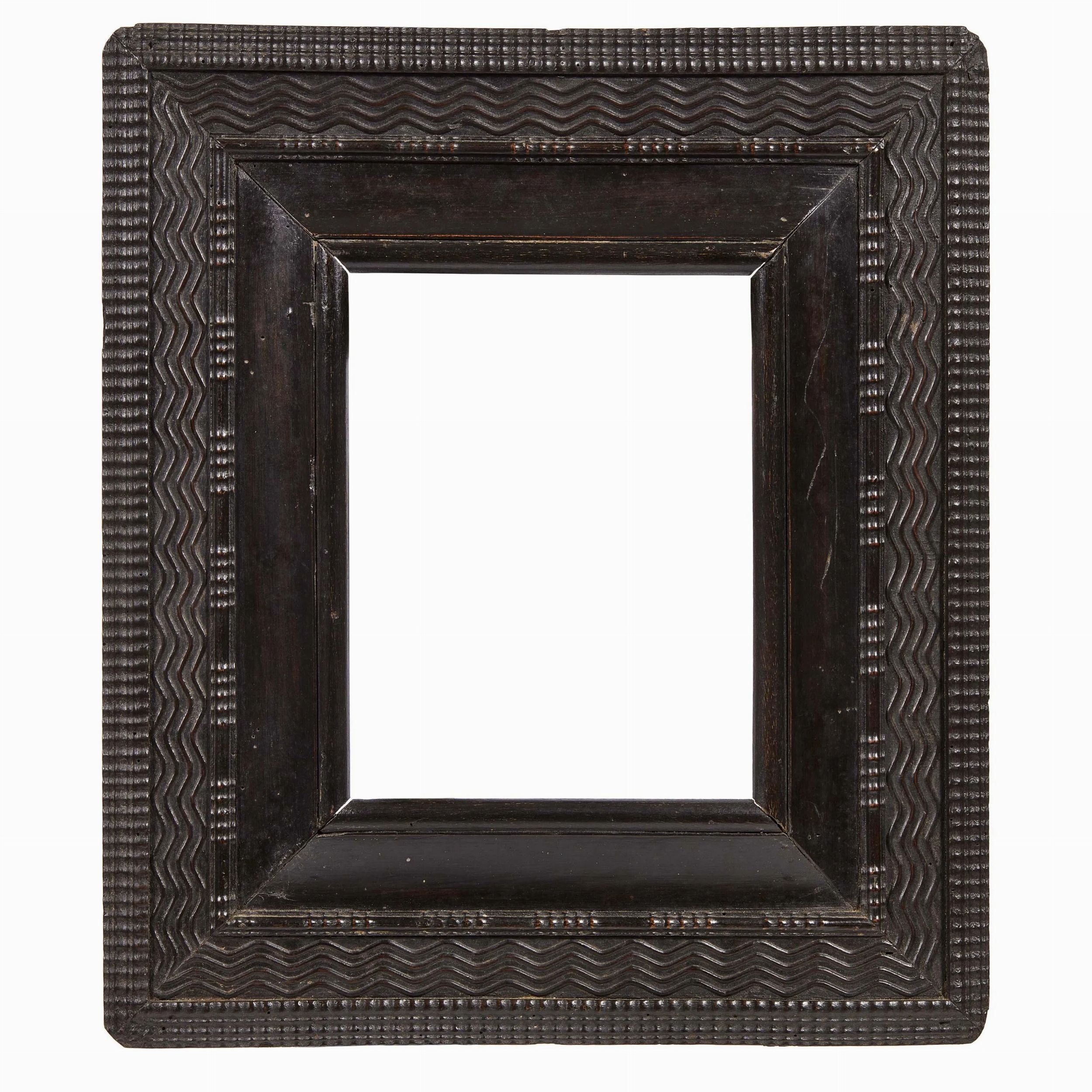 CORNICE, LOMBARDIA, SECOLO XVIII in legno intagliato ed ebanizzato, con profili e fasce esterne decorate con intaglio a guilloché , ingombro cm 43,5x38,4, luce cm 22,2x17