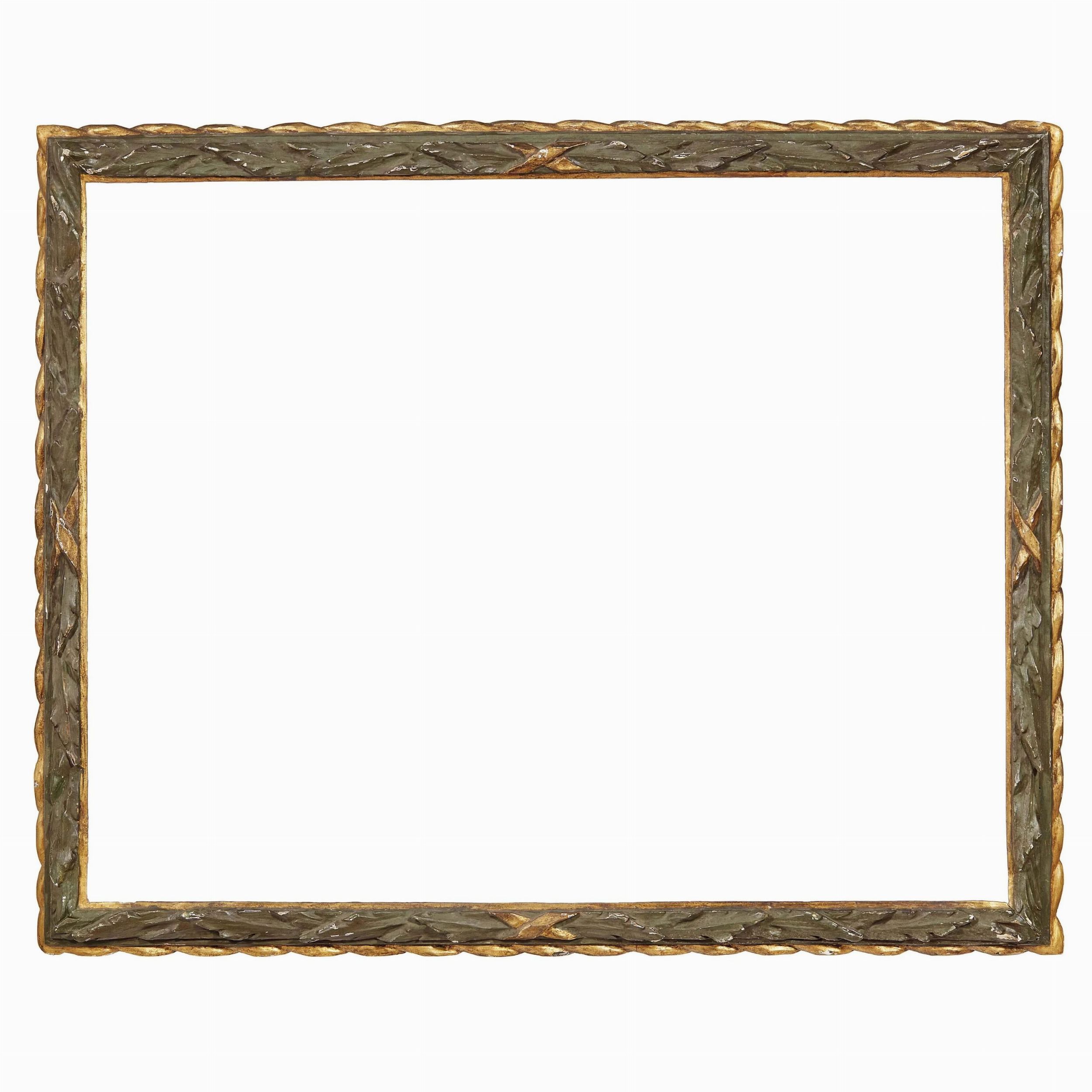 in legno dipinto e parzialmente dorato, sottile battuta dorata seguita da motivo sulla fascia centrale a foglie lanceolate fermate al centro da nastri dorati, si porta al muro con profilo dorato di forma mossa, ingombro cm, 138x112, luce cm 122x96,2