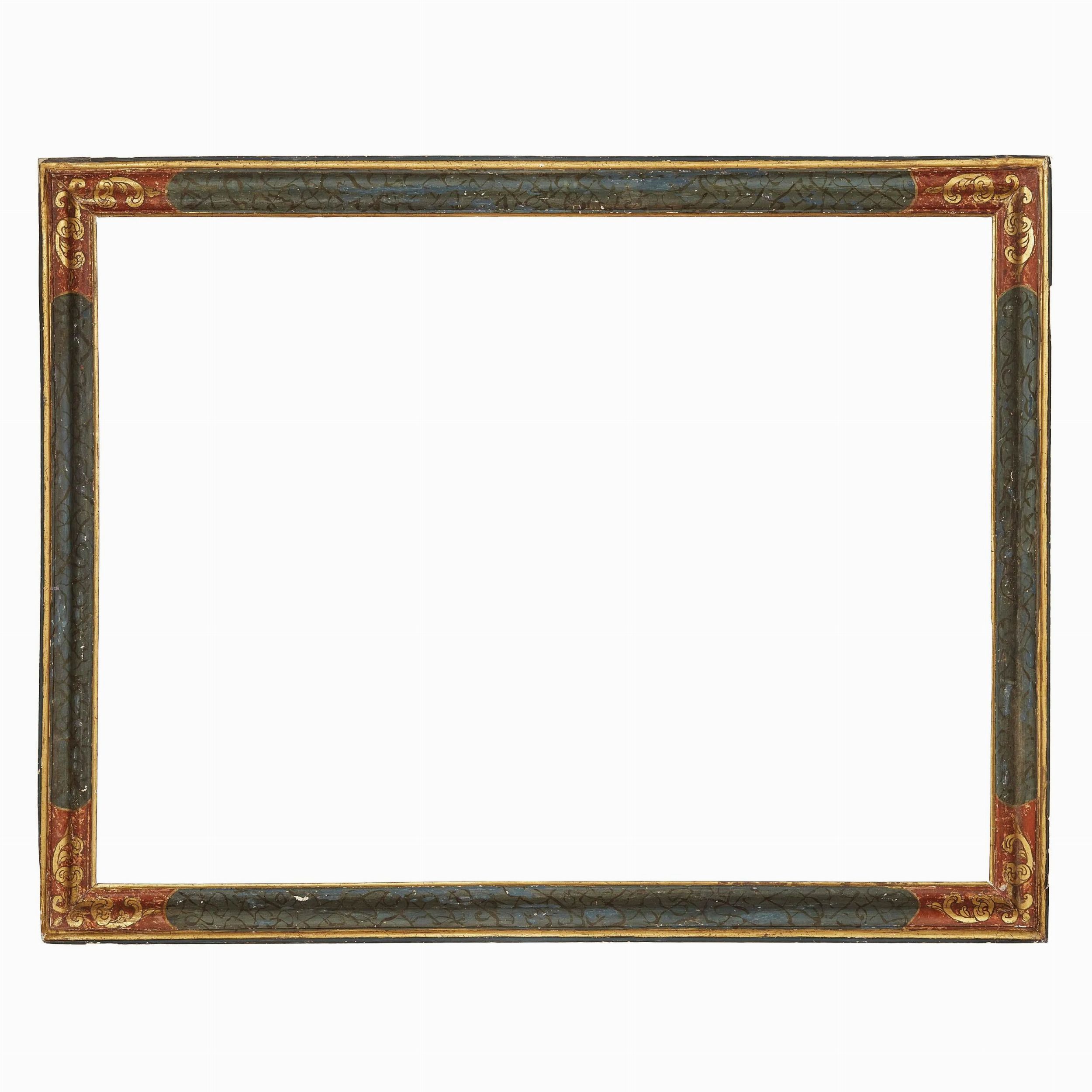 in legno dipinto e parzialmente dorato, sottile battuta dorata si apre su fascia dipinta a finto marmo alternata da riserve angolari con decoro dorato a girali, ingombro cm 124,5x159,8, luce cm 104,7x142,2.