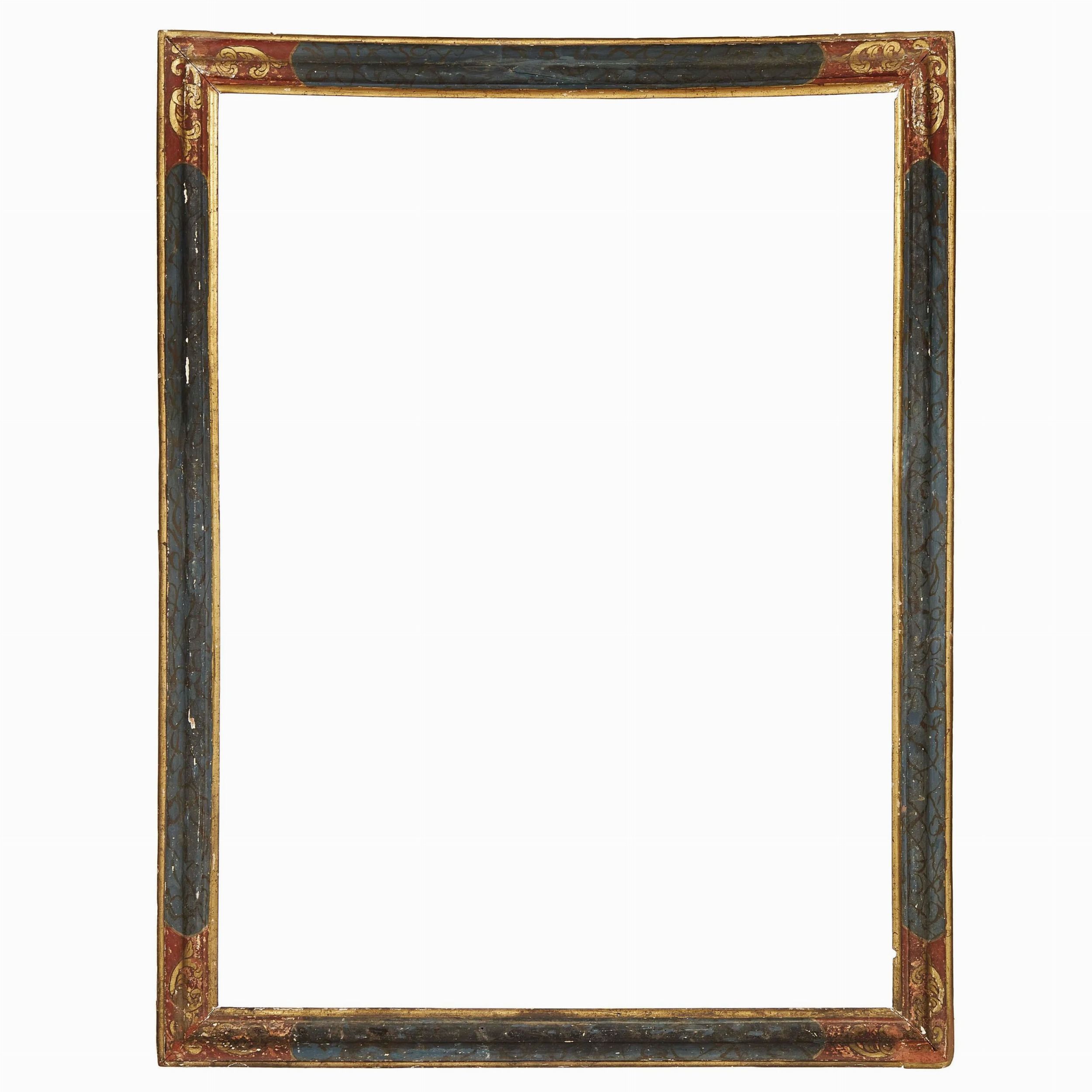 in legno dipinto e parzialmente dorato, sottile battuta dorata si apre su fascia dipinta a finto marmo alternata da riserve angolari con decoro dorato a girali, ingombro cm 156,3x117,3, luce cm 137,7x99,2