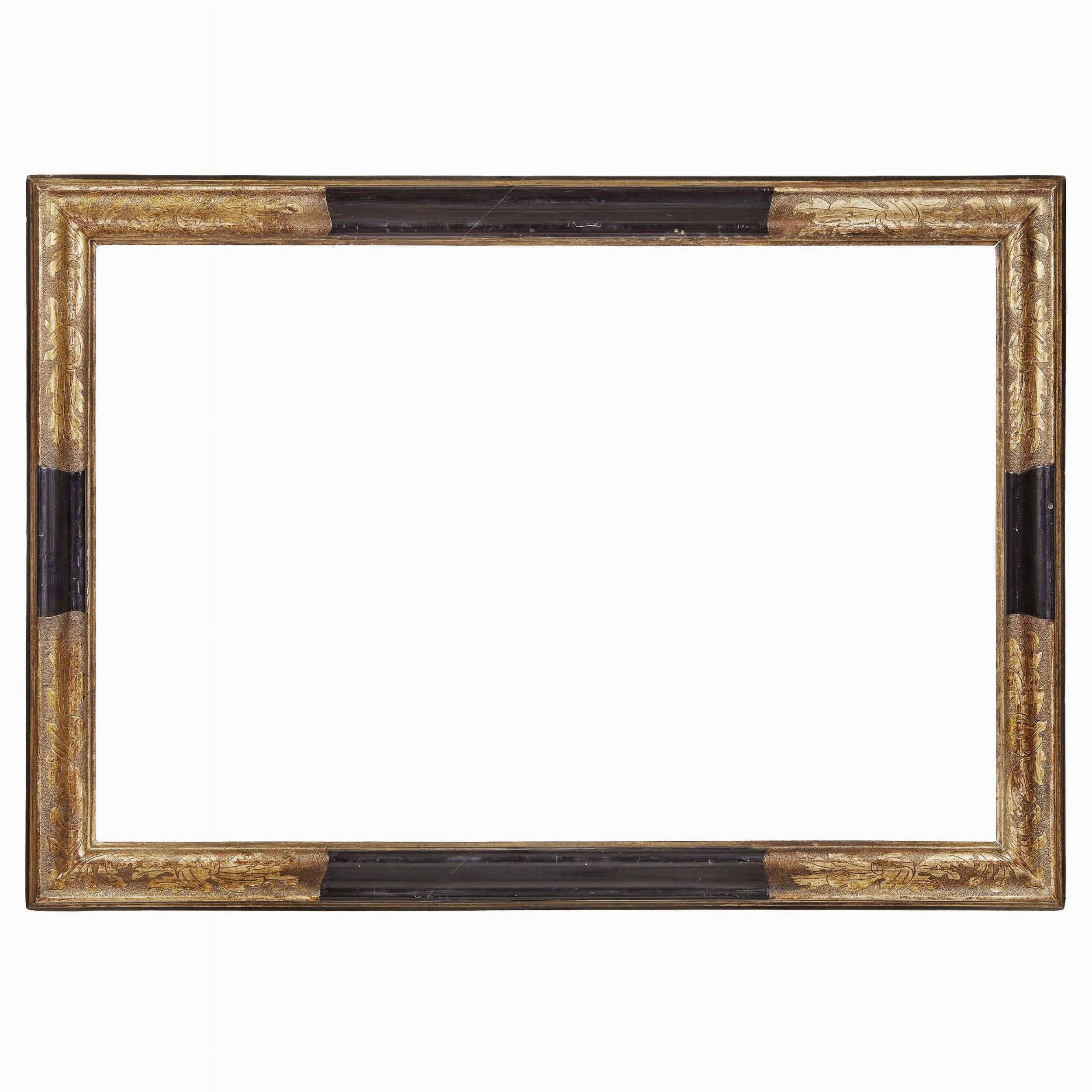 in legno ebanizzato e parzialmente deorato, decorazione fogliacea entro riserve angolari su fondo bulinato, ingombro cm 153,3x109,2, luce cm 133x87,8
