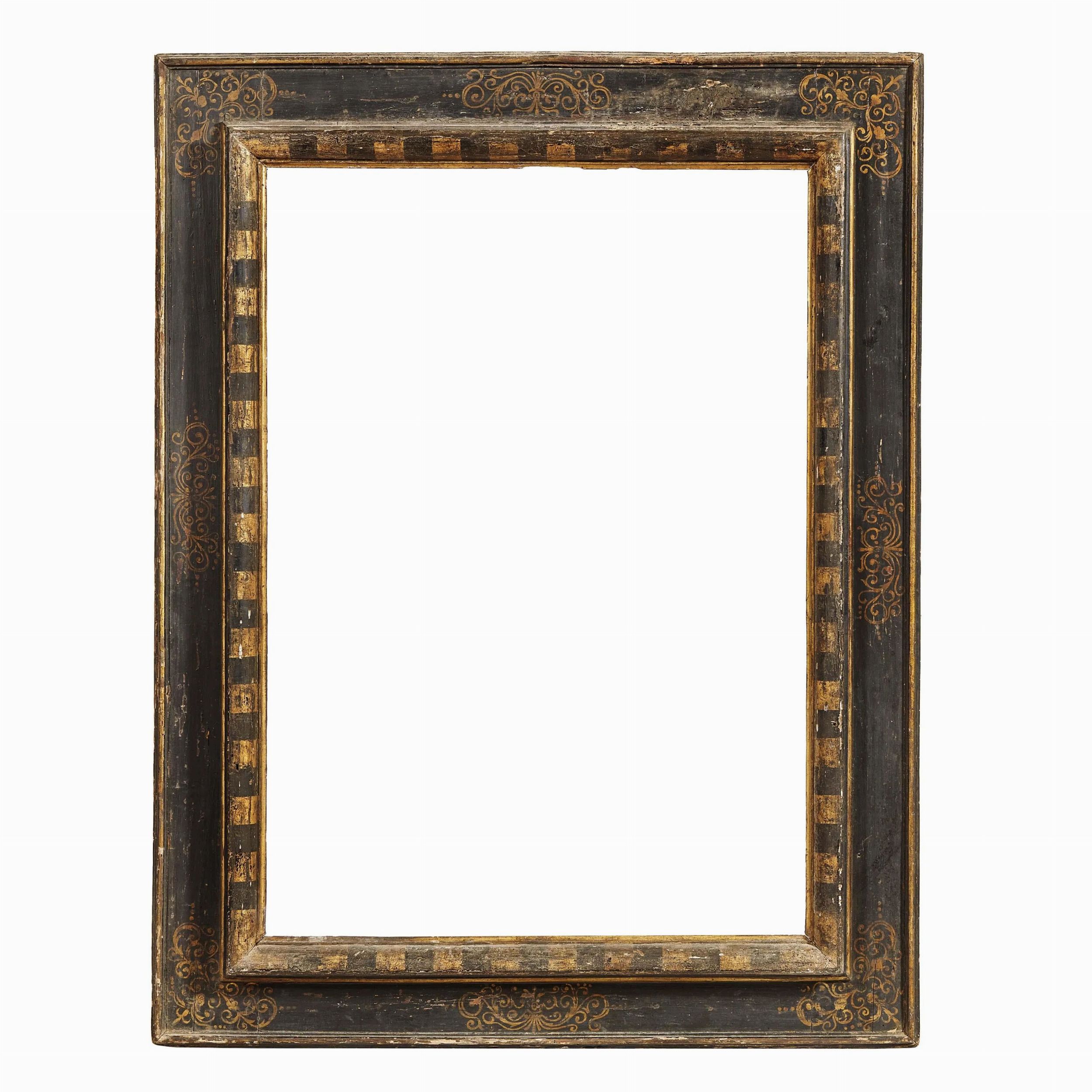 in legno ebanizzato e parzialmente dorato, sottile battuta dorata su apre su profilo aggettante bicromo, a cui segue fascia liscia con decorazione dorata a ramages agli angoli e ai centri, ingombro cm 174x134, luce cm 133,2x94,5