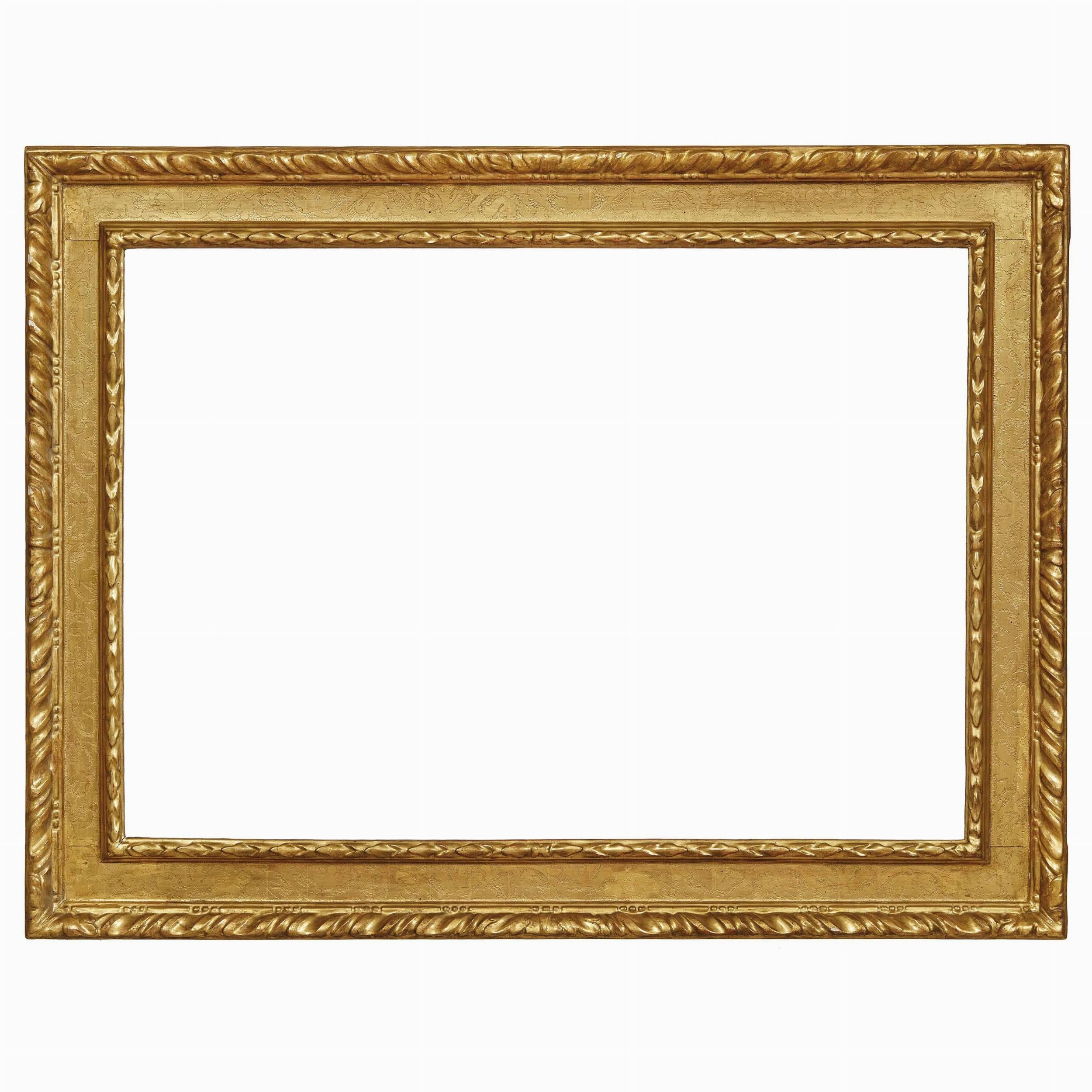 in legno intagliato e dorato, battuta si apre su profilo a foglie lanceolate, fascia centrale lavorata a bulino a motivo a girali, scende su profilo a fusarole e perline, si porta a muro con fascia esterna a mezzefoglie, ingombro cm 164x124,5, luce cm 132x92,3