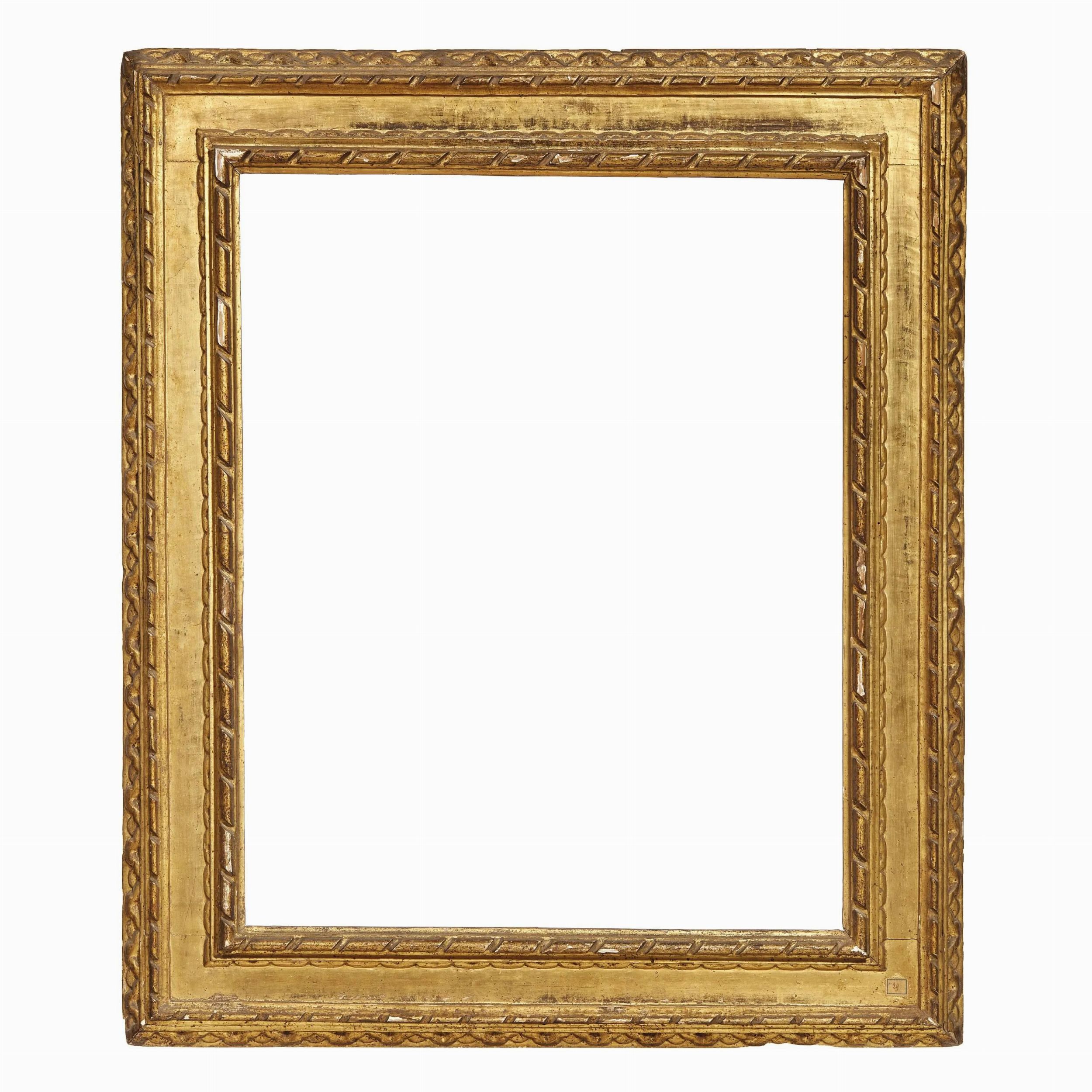 in legno intagliato e dorato, sottile battuta si apre su fascia a nastro stilizzato, sagoma a cassetta delimitata da profilature a dentelli, si porta a muro tramite fascia a mezzefoglie, ingombro cm 91x77,6, luce cm 67,7x54,1