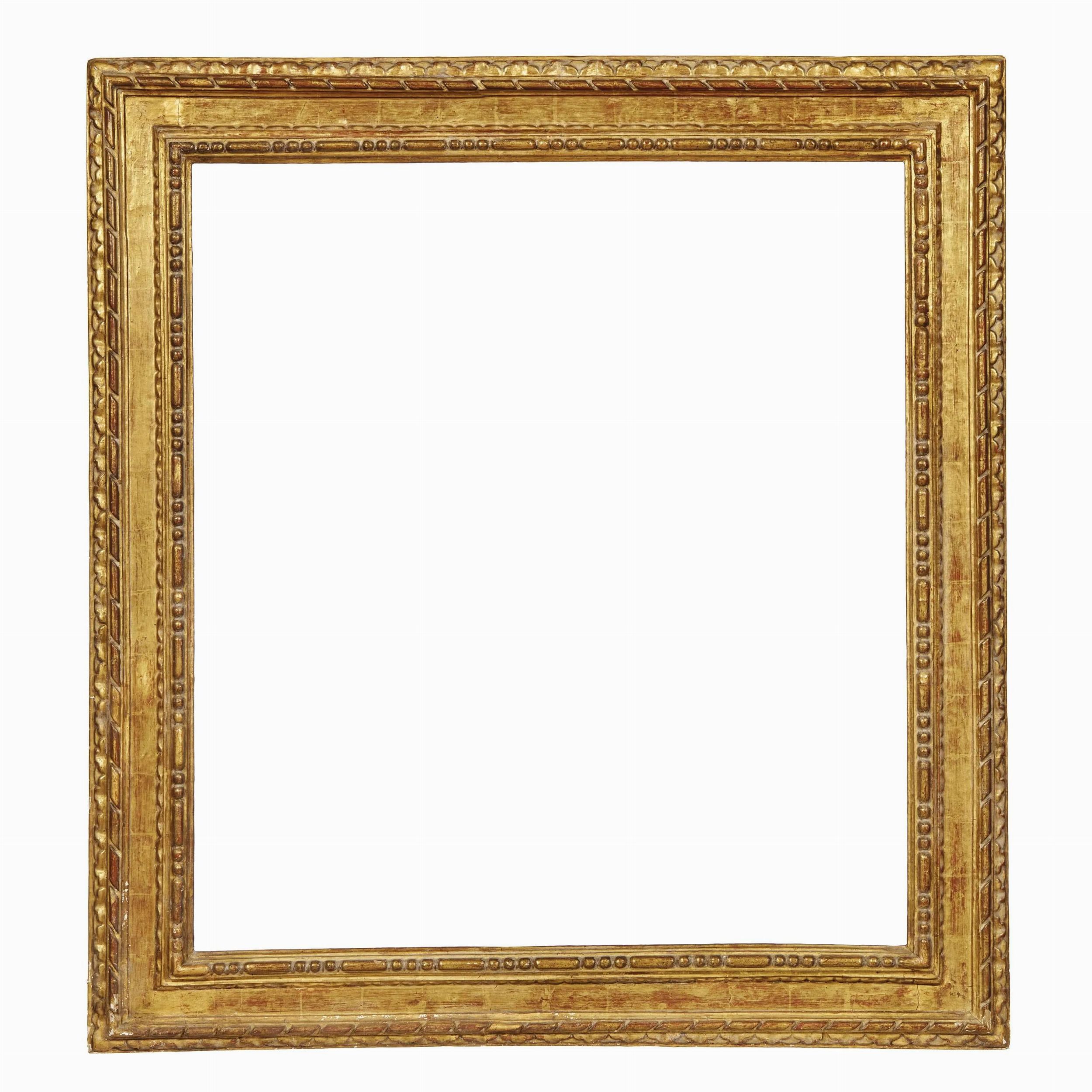 in legno intagliato e dorato, sottile battuta si apre su profilo a fusarole e perline e prosegue su fascia liascia che risale su motivo a nastrino stilizzato e successiva fascia ontagliata a mezzefoglie, si porta a murotramite più ordini di gole e modanature, ingombro cm 131,1x121,4, luce cm 104x94