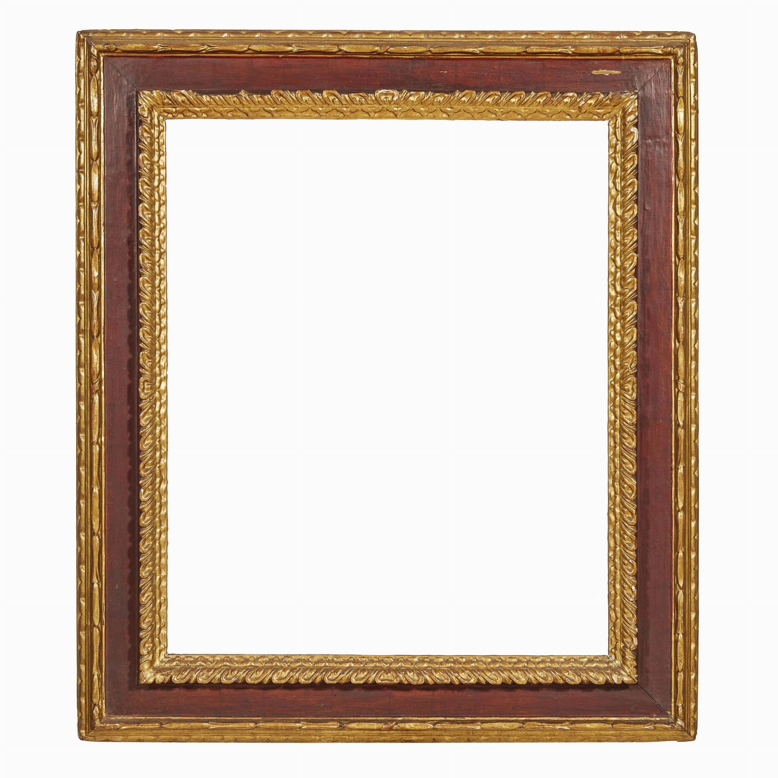 CORNICE, TOSCANA, SECOLO XVII in legno dipinto e parzialmente dorato, battuta dorata a mezzefoglie si apre su profilo a unghiature, prosegue su fascia dipinta in rosso e termina su più ordini di profilature dorate, ingombro cm 131x112, luce cm 97x79,3