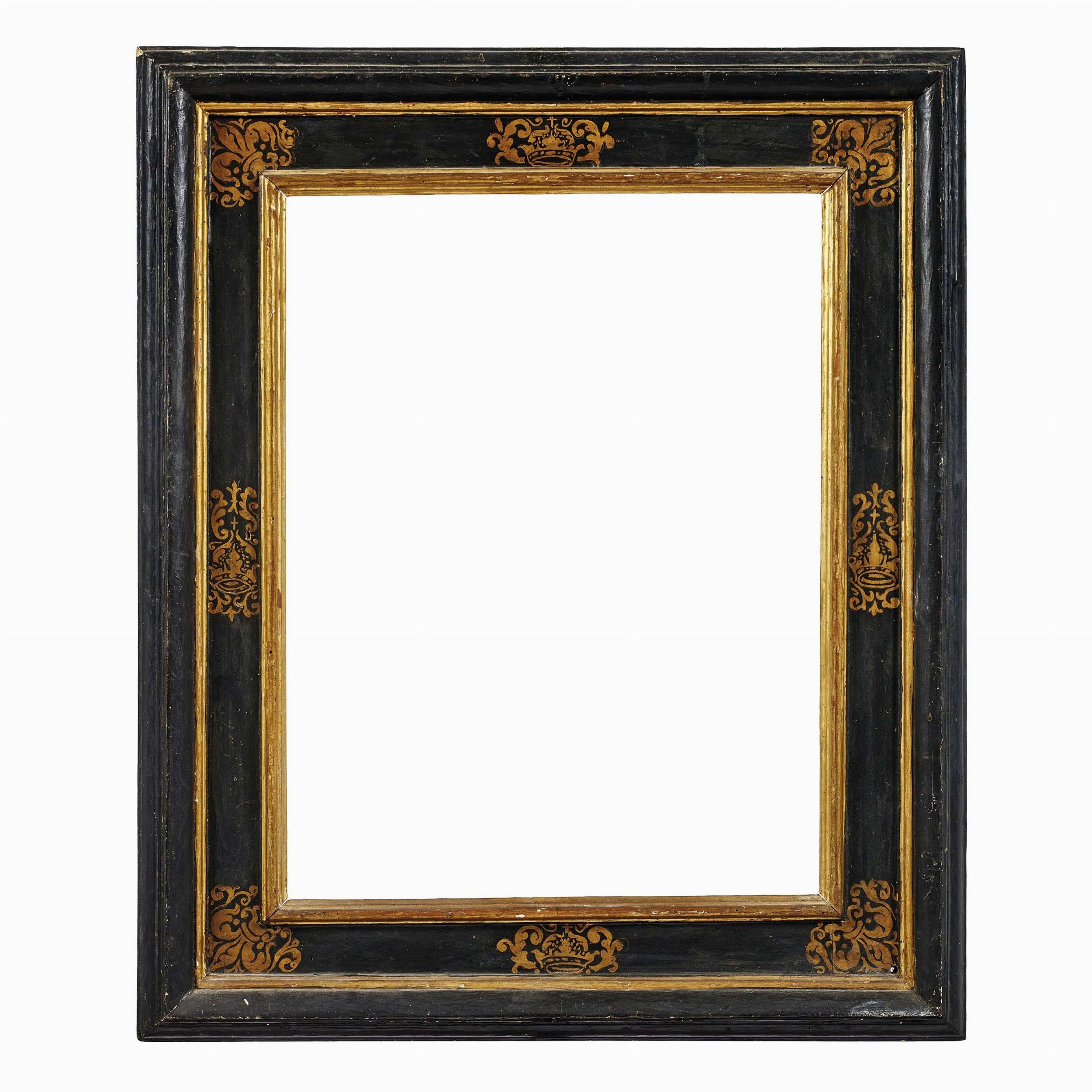 in legno ebanizzato e parzialmente dorato, battuta dorata sale mediante modanatura dorata su fascia con decorazione dorata raffigurante gigli agli angoli e corone entro girali fogliacei ai centri, si porta al muro tramite più ordini di modanature, ingombro cm 90,8x76, luce cm 63,4x48,4