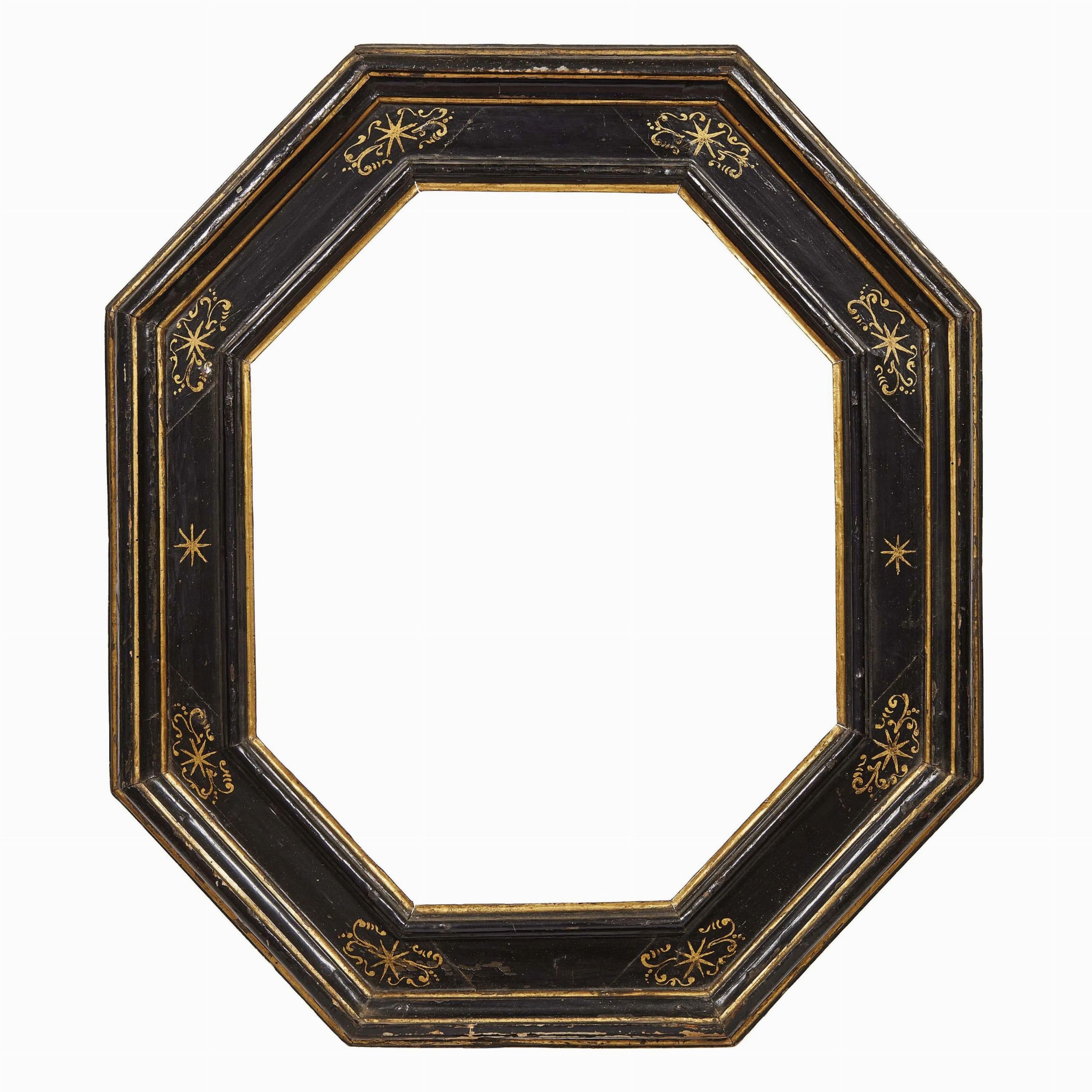 in legno intagliato e ebanizzato, di forma ottagonale con battuta dorata e fascia liscia decorata lungo gli angoli e ai lati da stelle stilizzate incise e dorate entro decoro a racemi, ingombro cm 81,5x67,9, luce cm 58,3x44,5