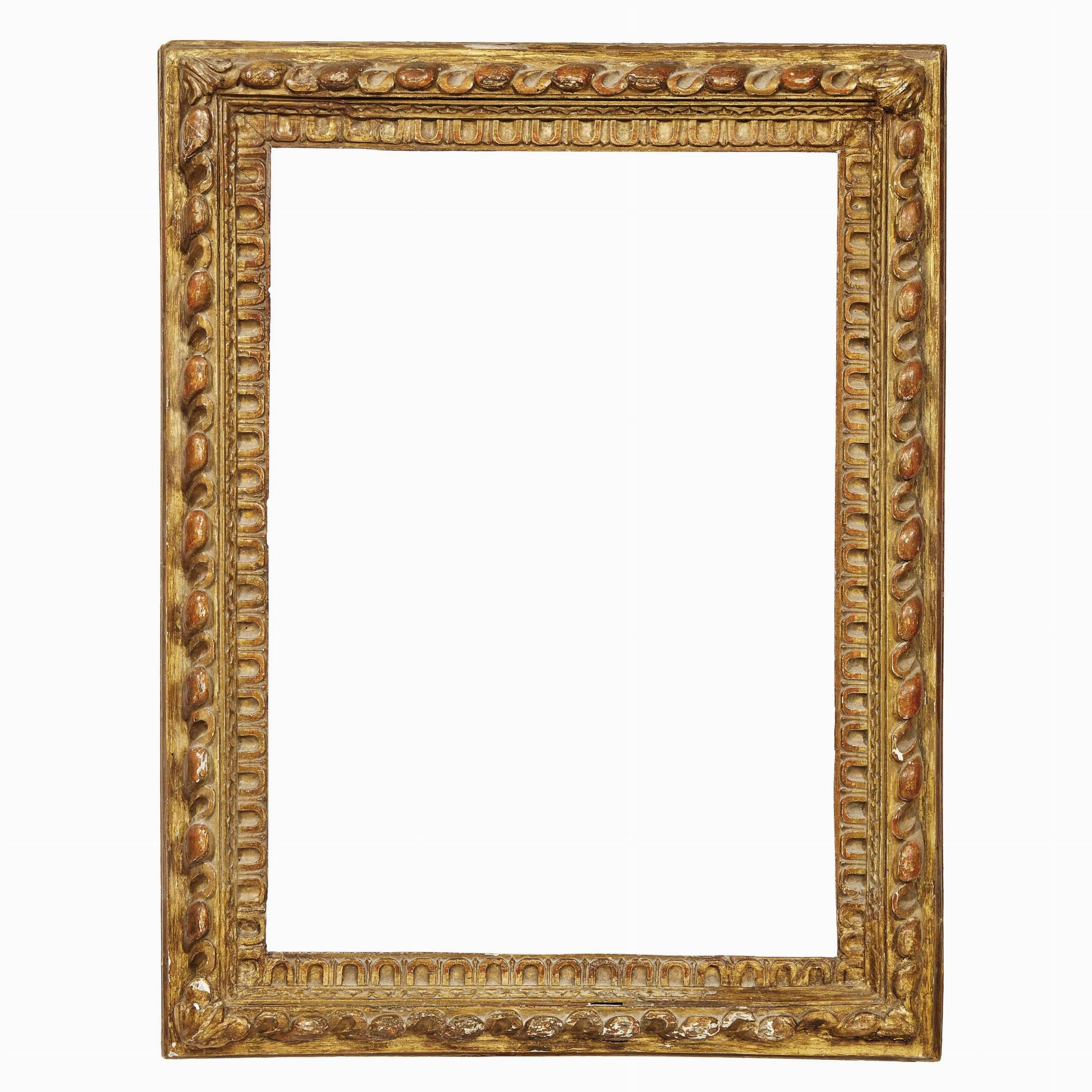 in legno scolpito intagliato e dorato, profili interessati da intagli a unghiature e a baccellature fermate agli angoli da foglie chiuse, ingombro cm 88,1x67, luce cm 69,3x48,5