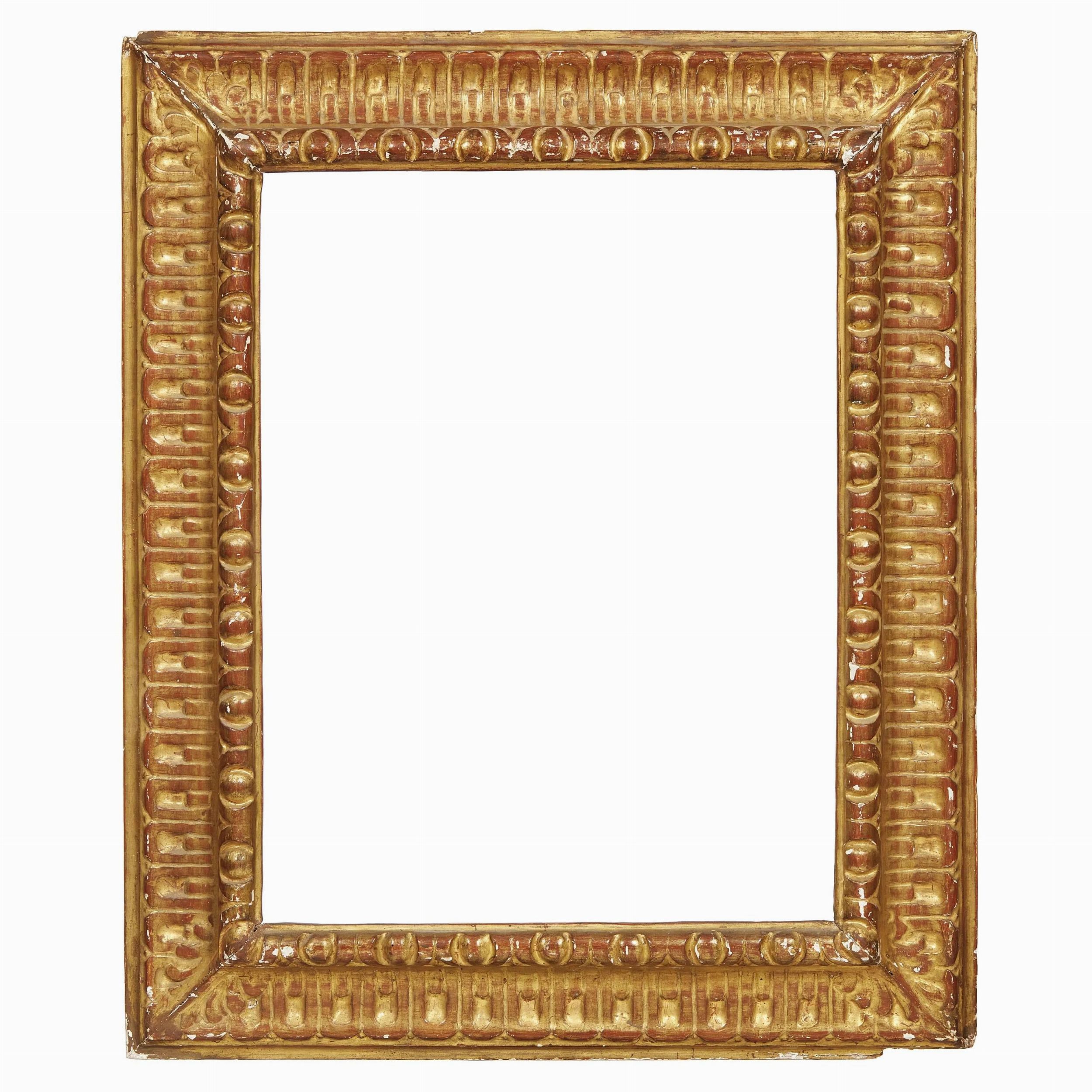 in legno intagliato e dorato, sottile battuta si apre su profilo bombato e fascia a gola entrambe interessate da motivo a baccellatura, ingombro cm 81,5x67,9, luce cm 58,3x44,5
