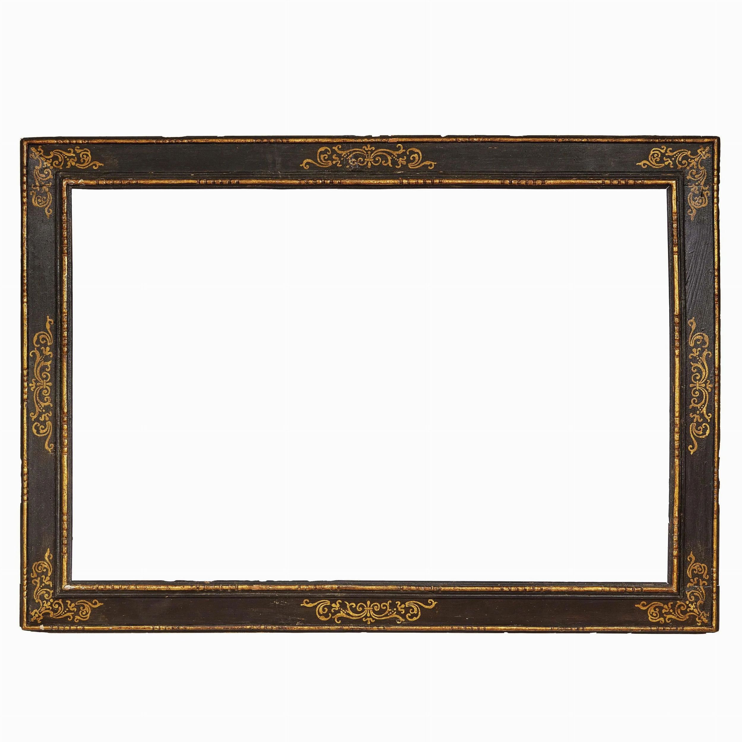 in legno ebanizzato, intagliato e parzialmente dorato, impreziosita agli angoli e ai centri da ramages dorati, ingombro cm 96,8x137,8, luce cm 75,9x116,5
