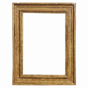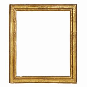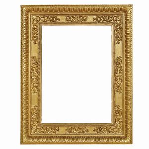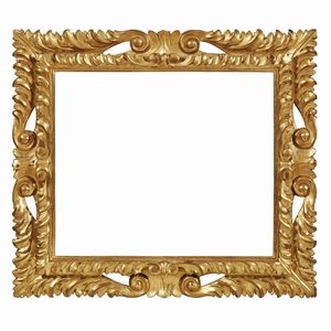 CORNICE, TOSCANA, SECOLO XVIII in legno dorato, battuta a mezzefoglie si apre su gola liscia, segue fascia a [..]