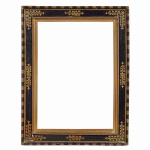 CORNICE, EMILIA, SECOLO XVII in legno ebanizzato e dorato, sottile battuta dorata si apre su fascia a nastro [..]