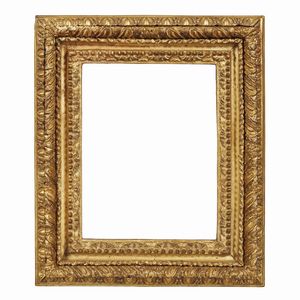 CORNICE, ROMA, SECOLO XVII in legno intagliato e dorato, battuta a mezzefoglie prosegue su fascia a perline [..]