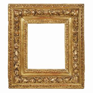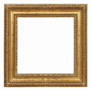 CORNICE, FIRENZE, SECOLO XVI in legno intagliato e dorato, alla sottile battuta segue profilo perlinato e fascia [..]