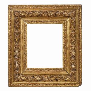 COPPIA DI CORNICI, ROMA, SECOLO XVIII in legno intagliato e dorato, sottile battuta sale su profilo a palmette [..]