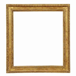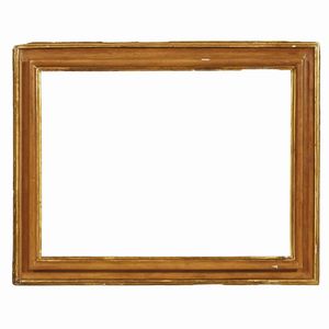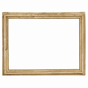 CORNICE, TOSCANA, SECOLO XVII in legno intagliato e dorato, sottile battuta si apre su profilo a fusarole e [..]