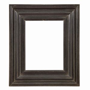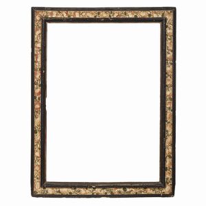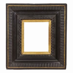 CORNICE, TOSCANA, SECOLO XVII in legno intagliato, ebanizzato e parzialmente dorato, battuta dorata con profilo [..]