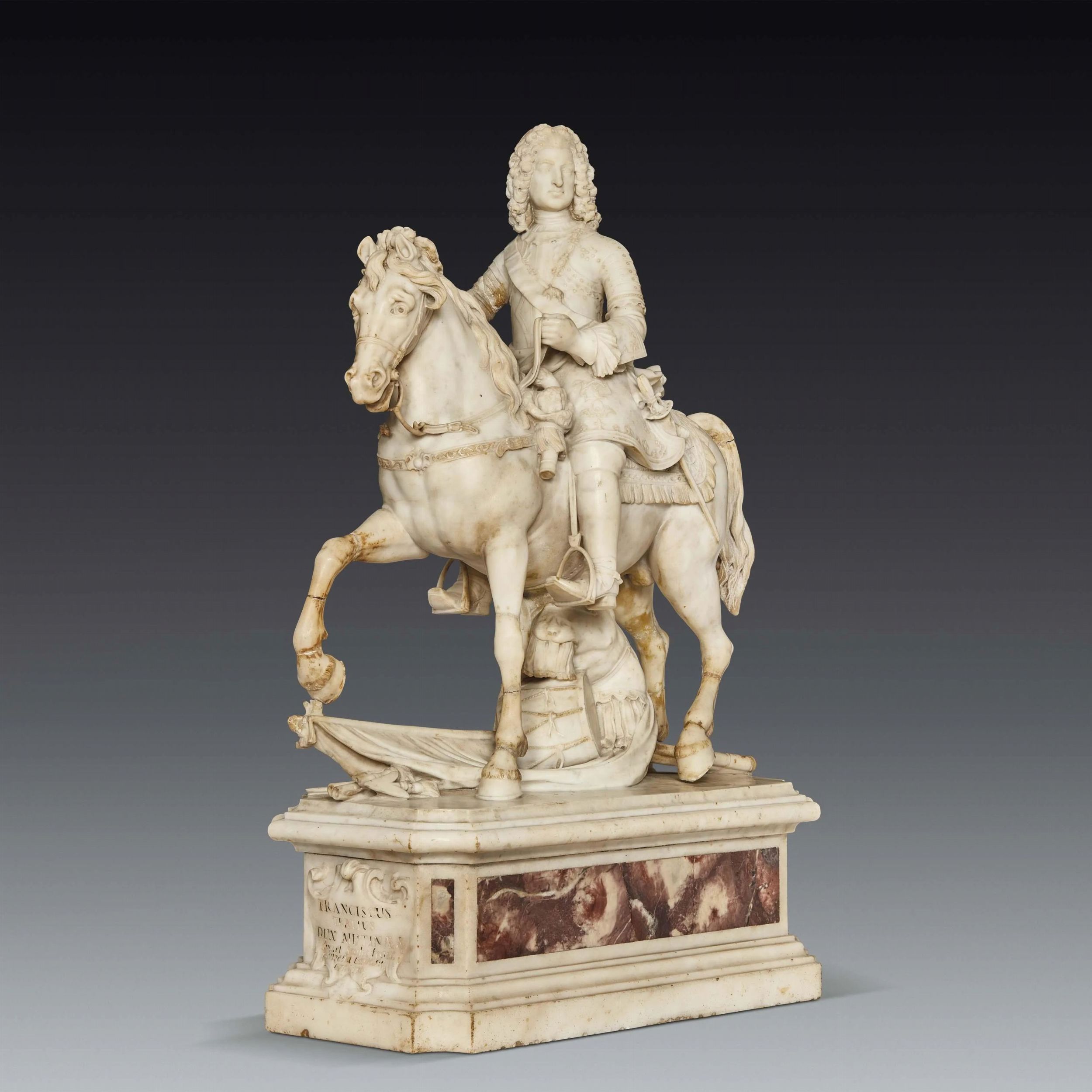 BOZZETTO PER IL MONUMENTO EQUESTRE A FRANCESCO III D'ESTE DUCA DI MODENA, 1750 scultura in marmo bianco di Carrara con inserti in marmo rosso sul basamento. Sul fronte della base iscrizione: FRANCISCUS/ TERTIUS/ DUX MUTINAE/ Inv. et Sculp: Fran:/ Panzetta Carrarie/ an: 1750 . Cm 71x47x22,5