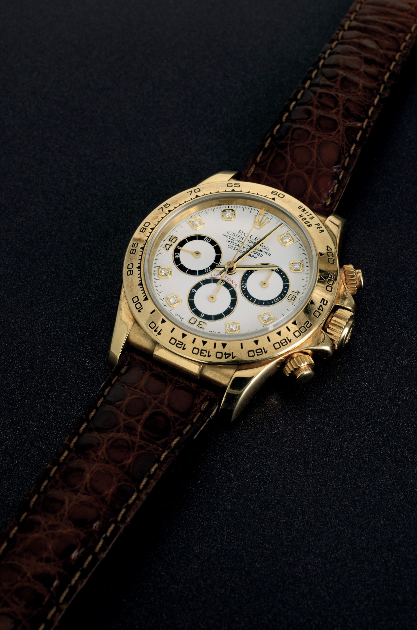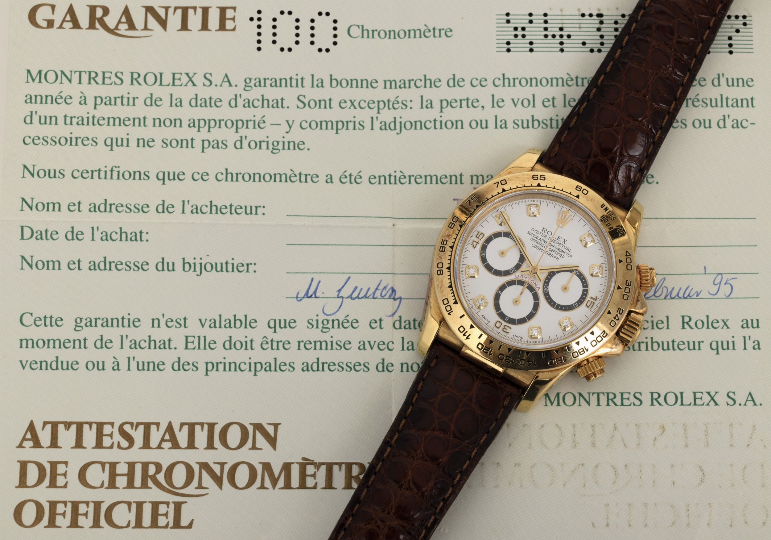 Daytona ref 16518, in oro giallo 18k, quadrante bianco indici in diamanti, mai lucidato, [..]