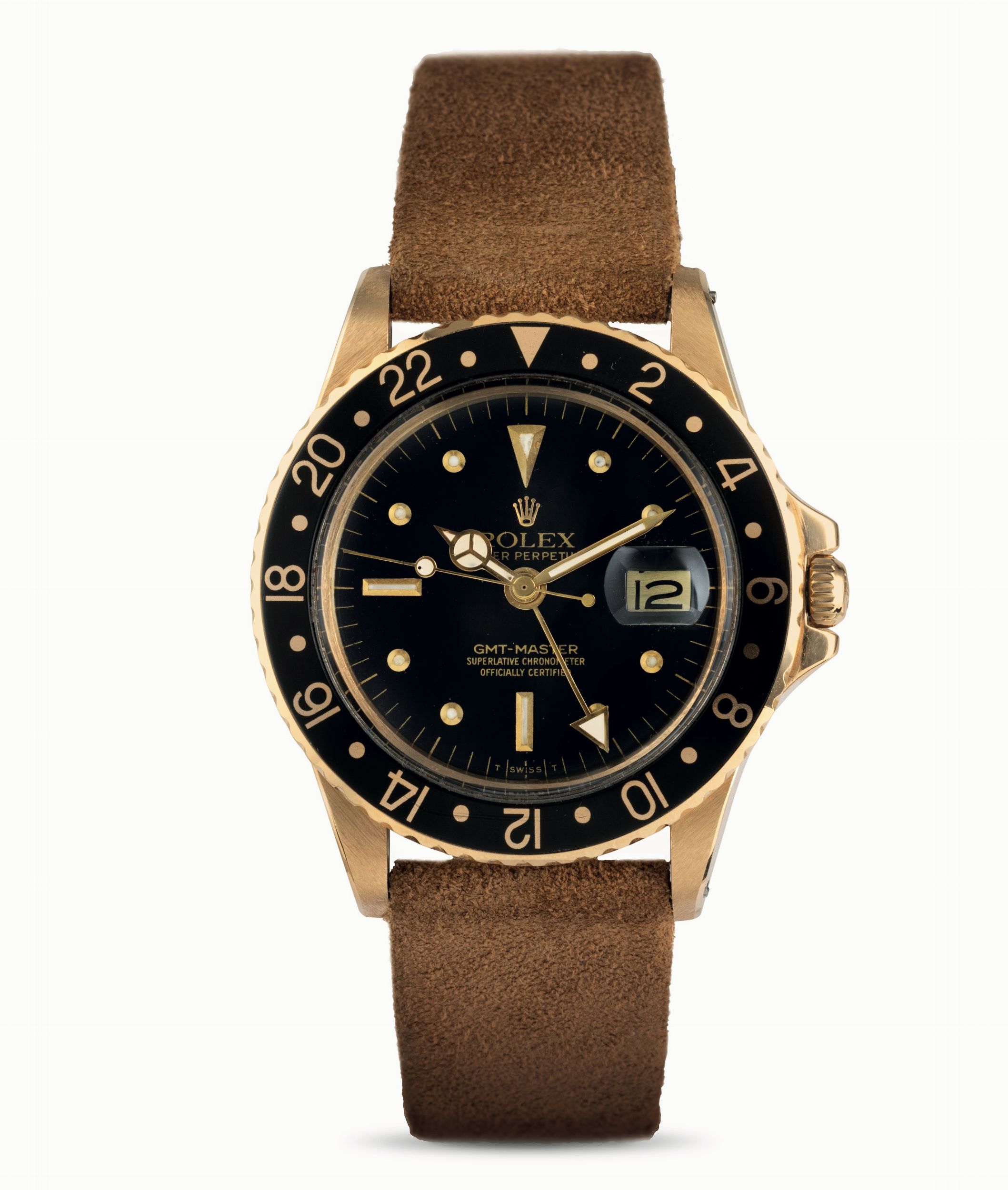 GMT Master ref 1675/8 in oro giallo 18k, quadrante nero Nipple e cinturino in pe [..]