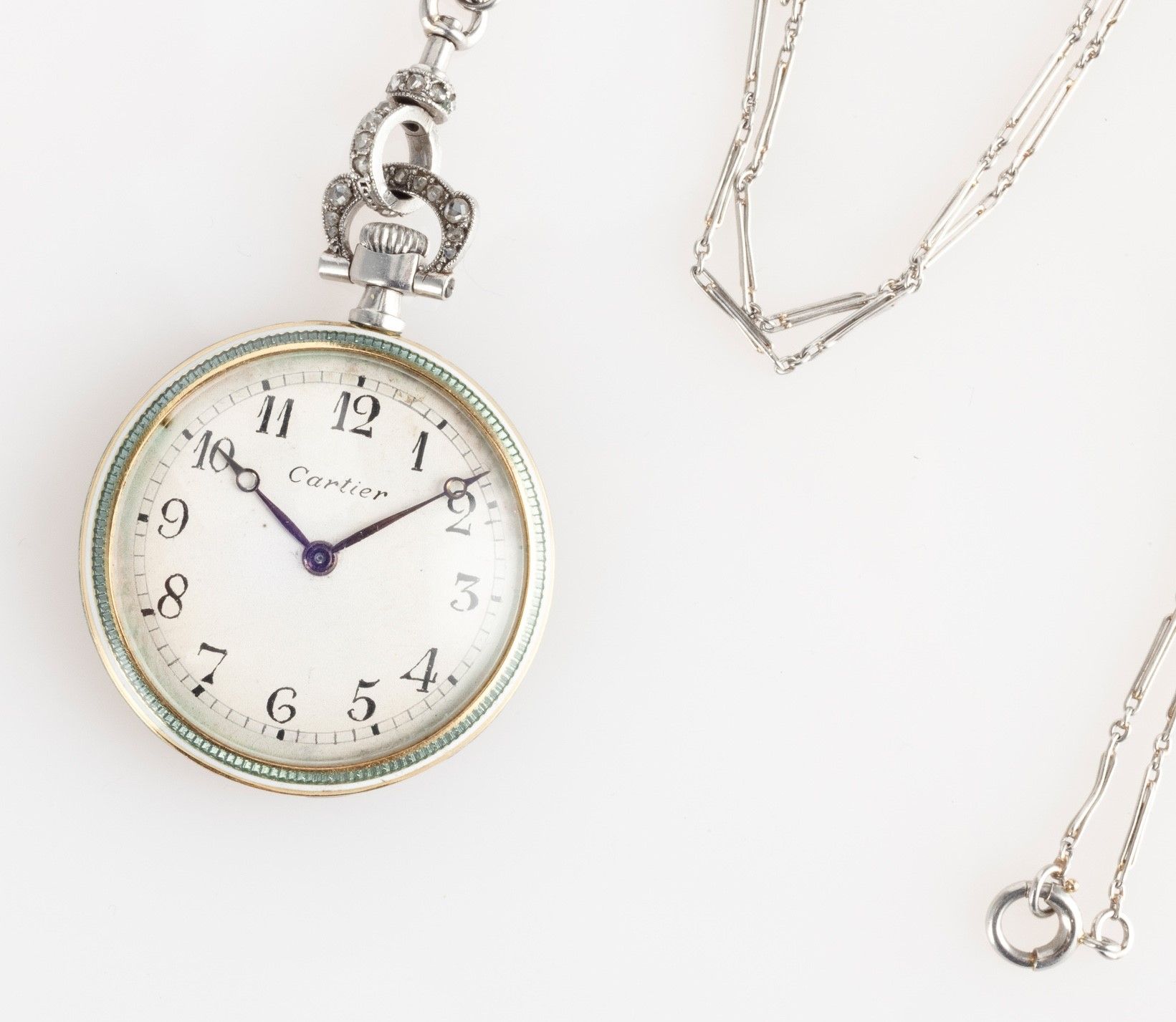 Orologio da collo in platino con smalto azzurro al retro, numeri Arabi e sfere B [..]