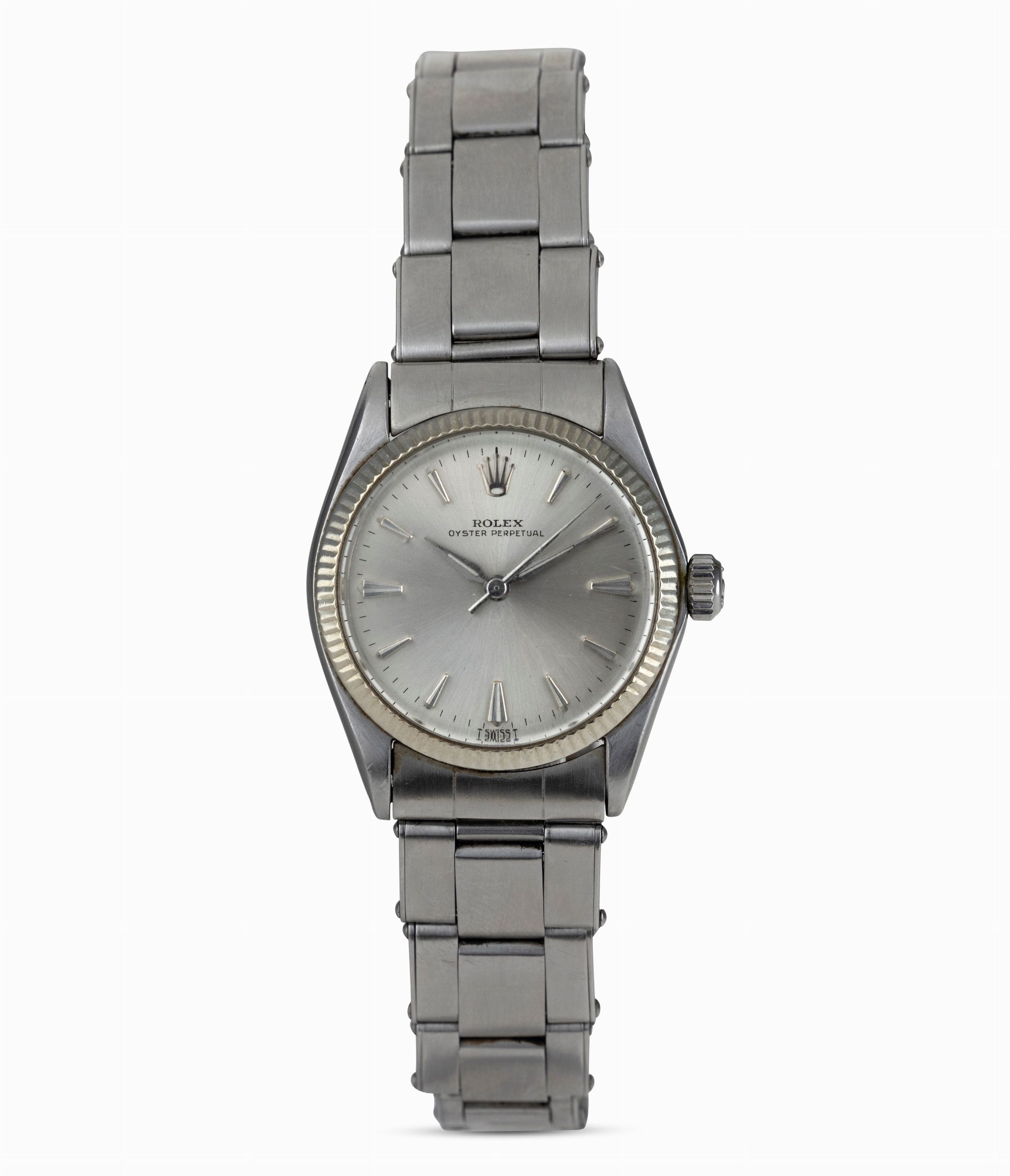 Oyster Perpetual, ref 6551, quadrante argentè con indici a bastone, bracciale rivettato [..]