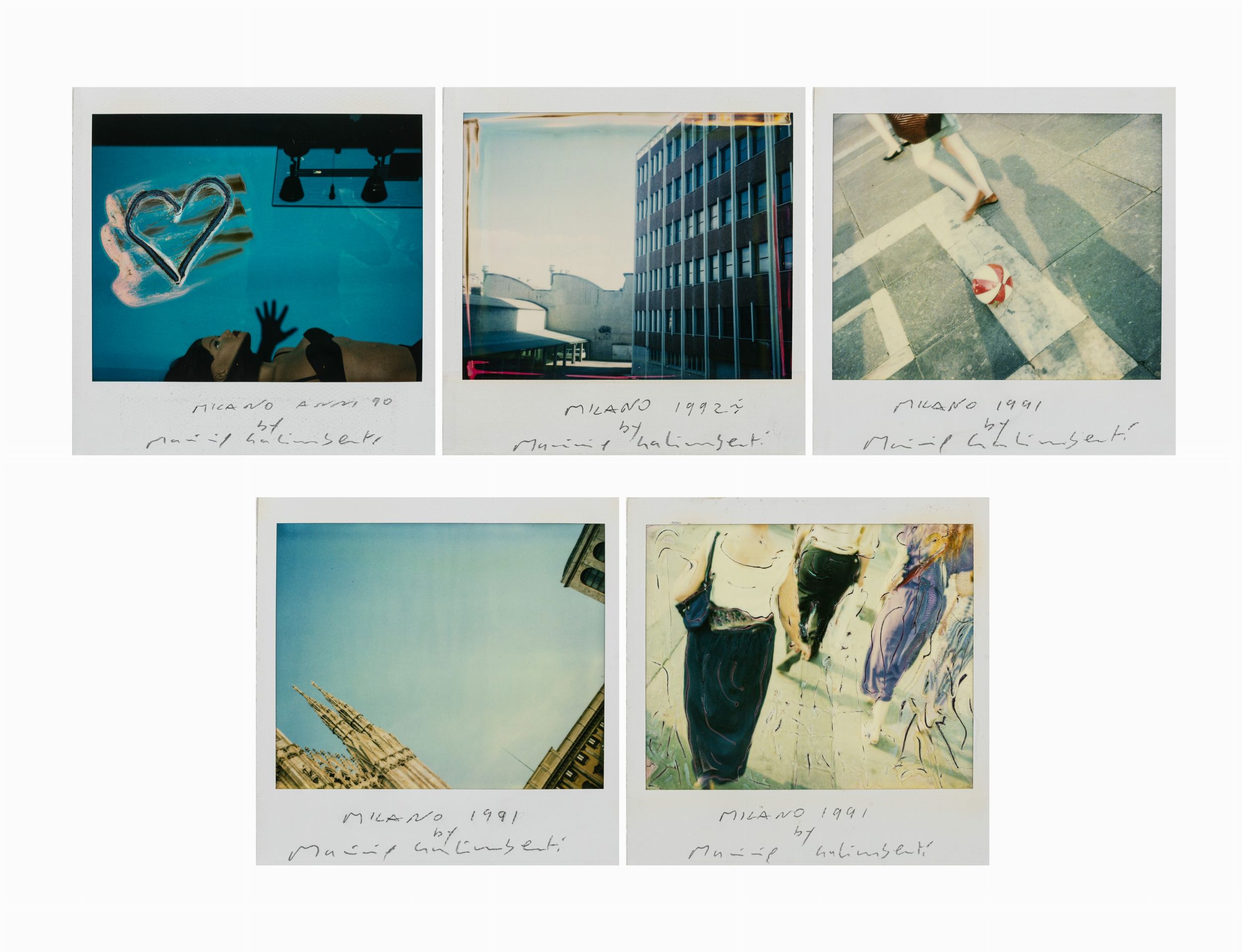 Cinque polaroid manipolate, cm 10,3 x 10,3 ciascuna
