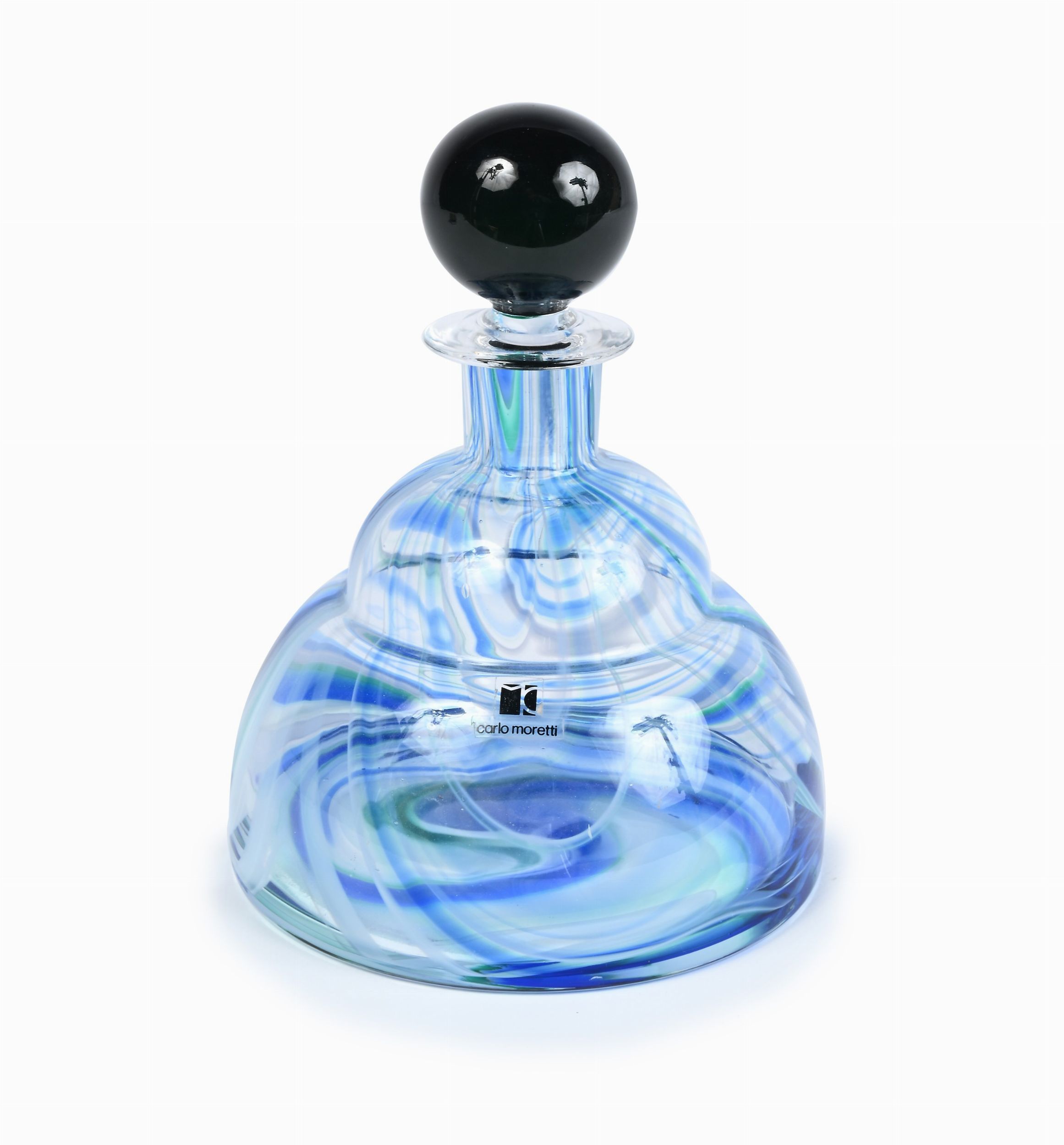 Bottiglia con venature elicoidali e tappo sferico blu. Etichetta adesiva Carlo Moretti. La Carlo Moretti è una “fabbrica d’autore” fondata nel 1958 da Carlo e Giovanni Moretti
