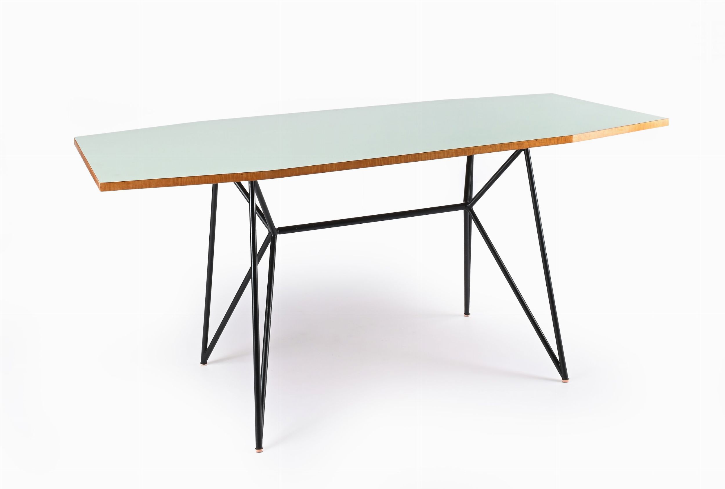 Tavolo da pranzo in legno con piano satinato azzurro e struttura in metallo
