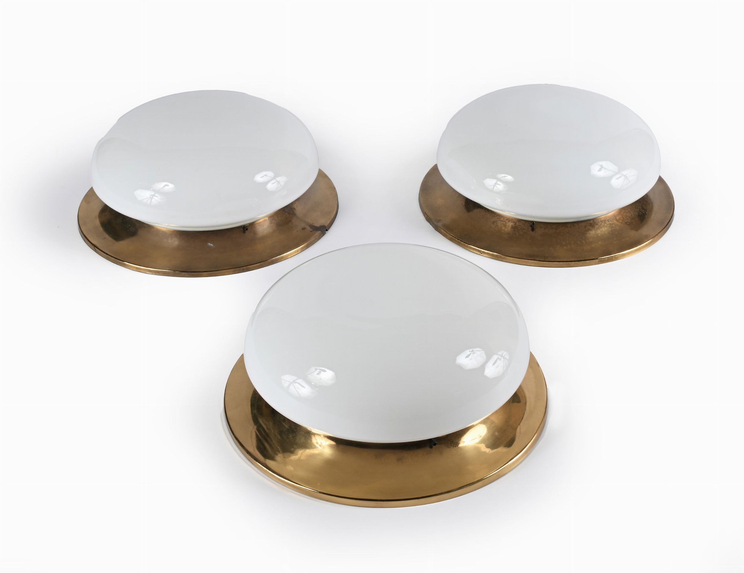 Tre grandi plafoniere in ottone e vetro