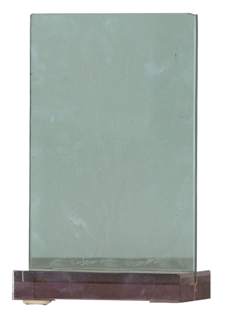 Vetro incisso, cm. 20x13 su, base di plexiglass cm. 2x13x7
