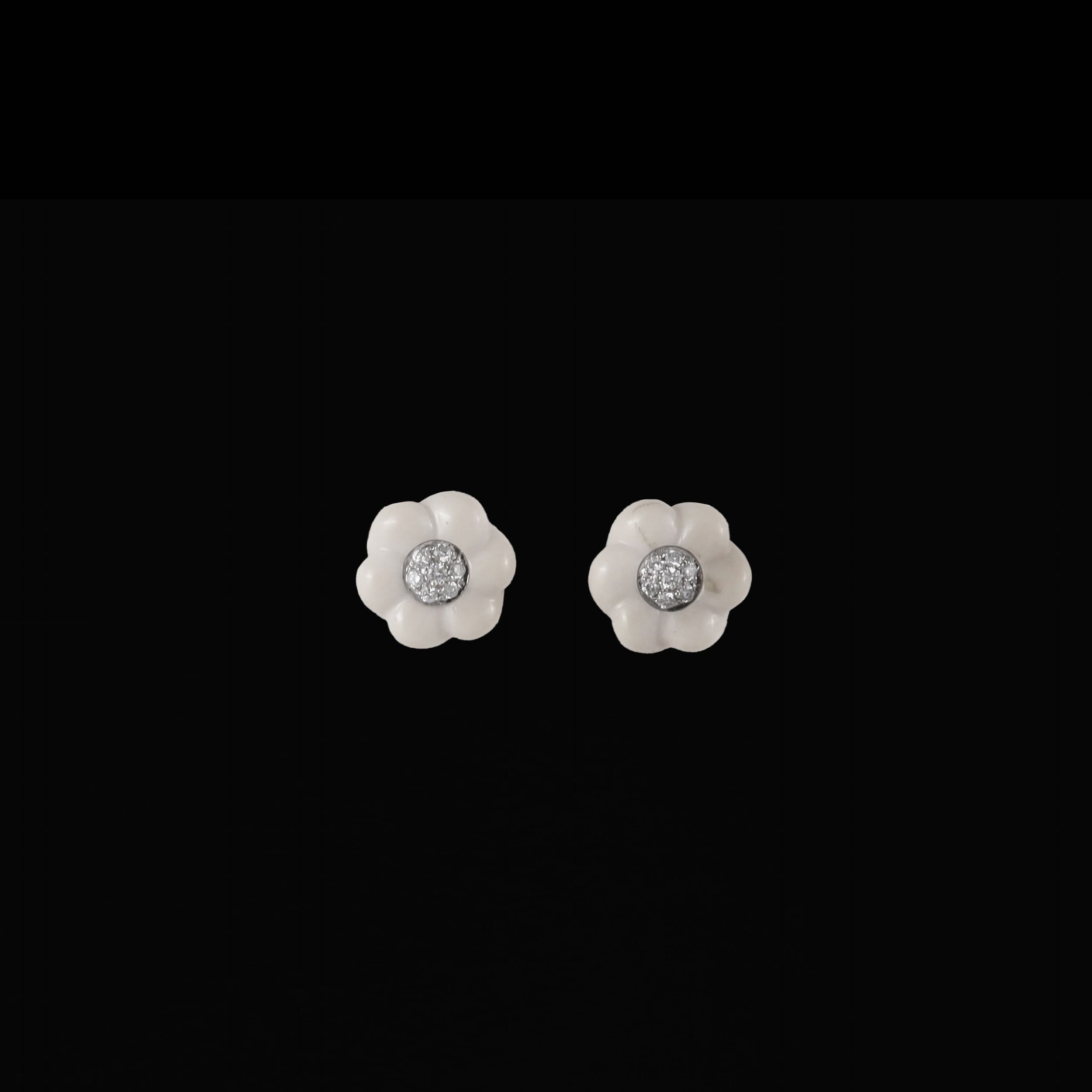 a clip in oro bianco ciascuno con fiore in agata bianca e pavé di brillanti del peso complessivo di 0,60 ct ca., gr. 11,3. Diametro 1,7 cm ca. Firmati: Loris Abate
