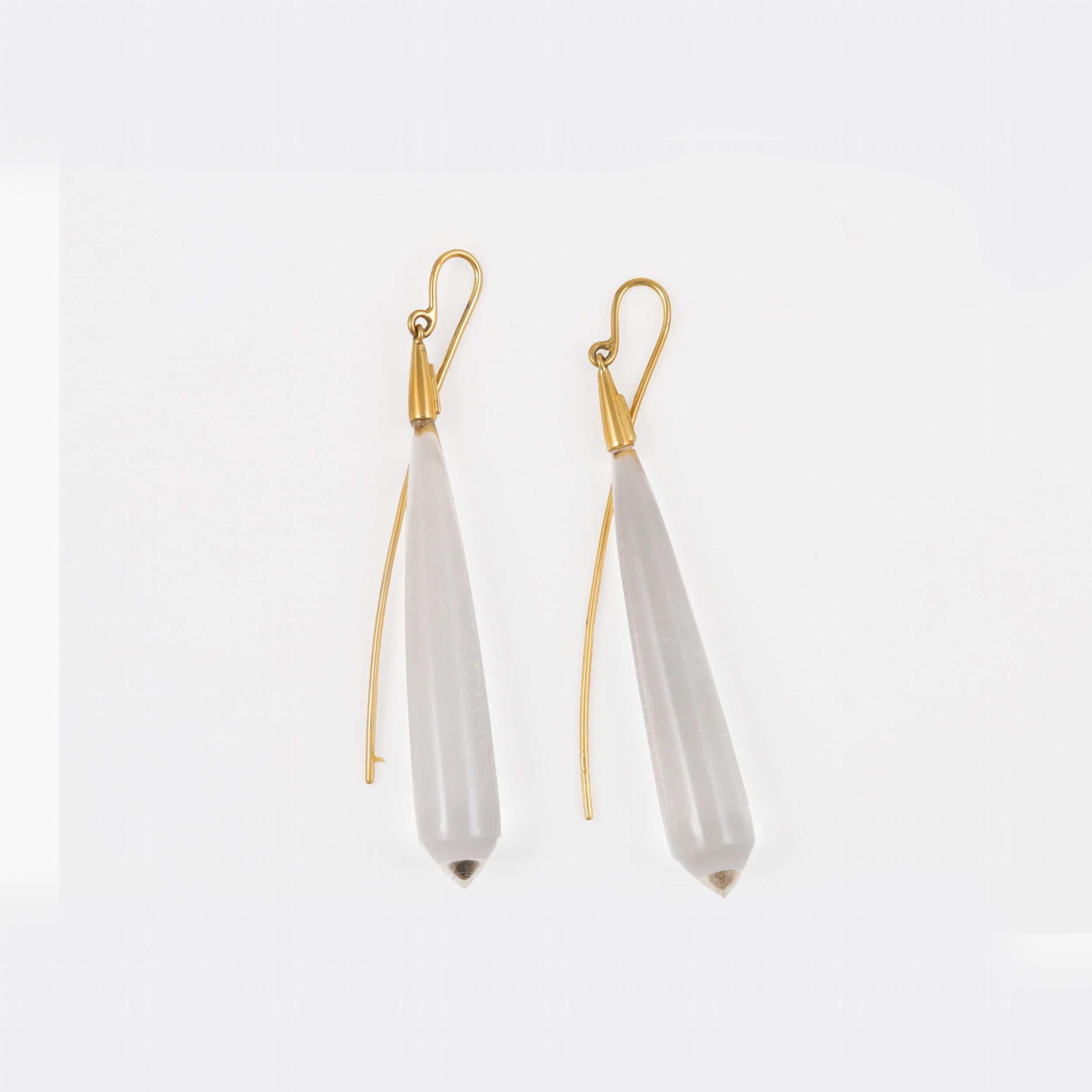 lunghi pendenti in oro giallo ciascuno con quarzo ialino, gr. 17,4. Lunghezza 8,5 cm ca. Firmati: Loris Abate